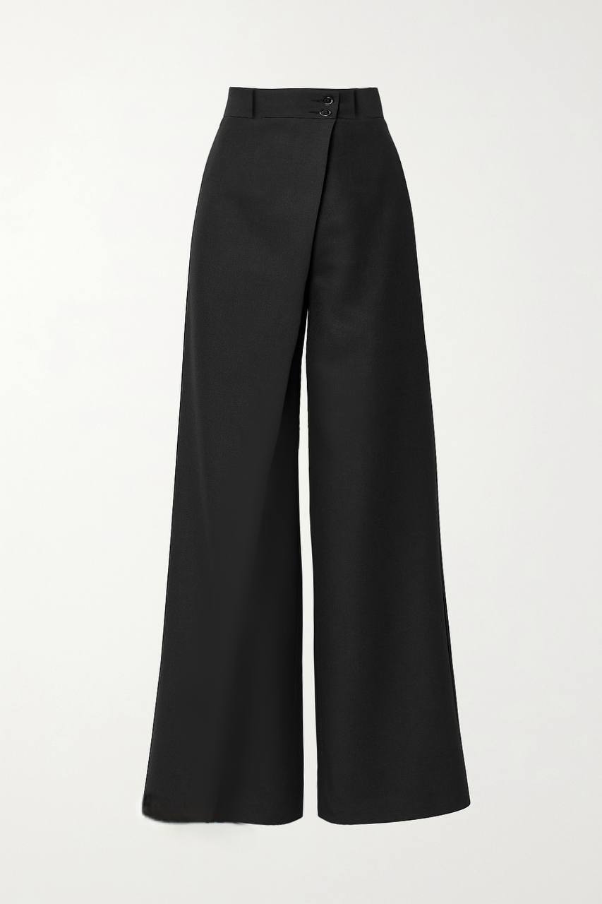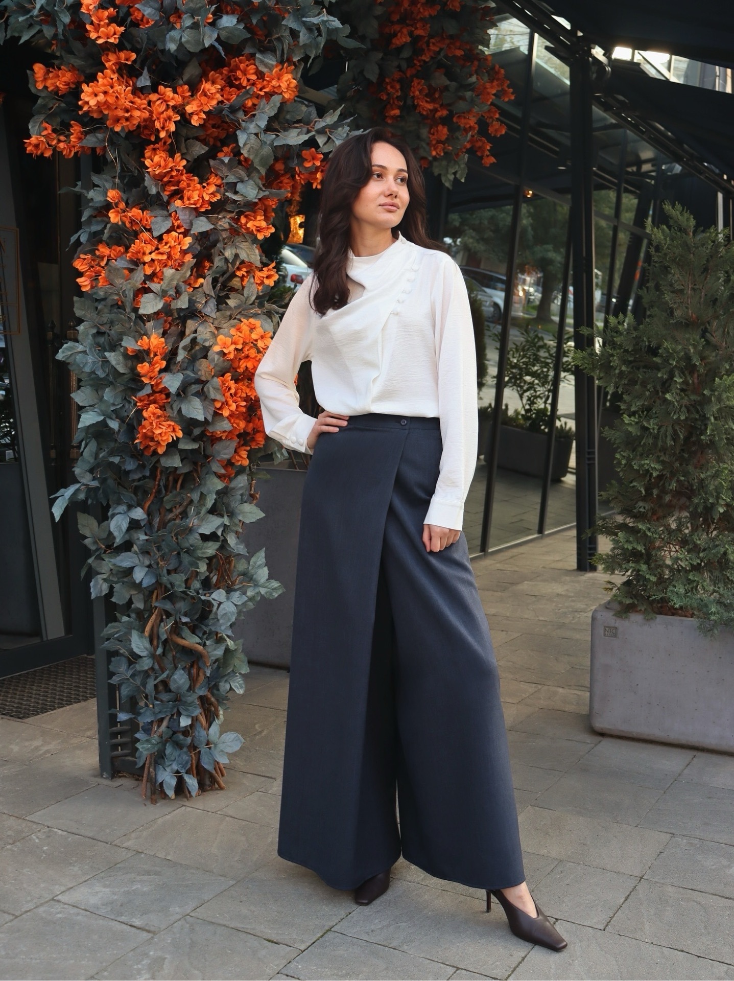 Эти брюки — переосмысление классики с актуальным силуэтом. Элегантная модель с эффектом запаха создаёт визуальный акцент и подчёркивает талию. Благодаря защипам в верхней части брюки мягко садятся по фигуре, формируя женственный силуэт, а объёмная широкая штанина дарит комфорт и свободу движений.