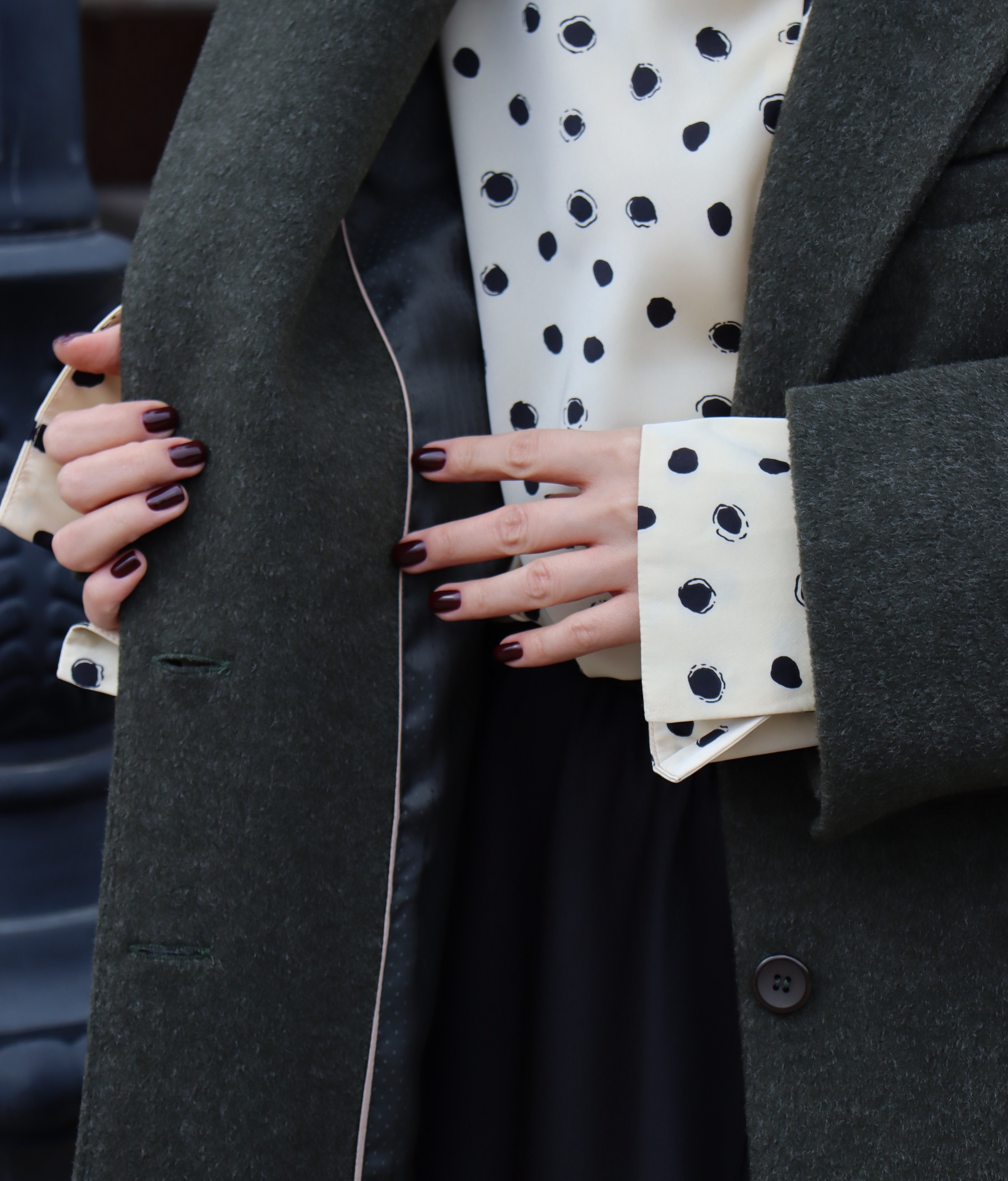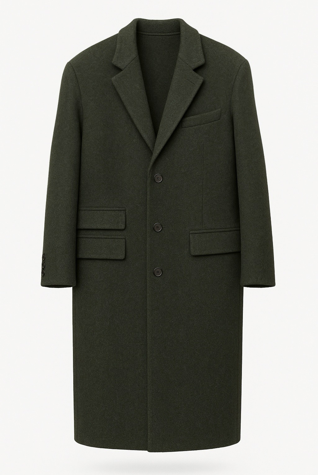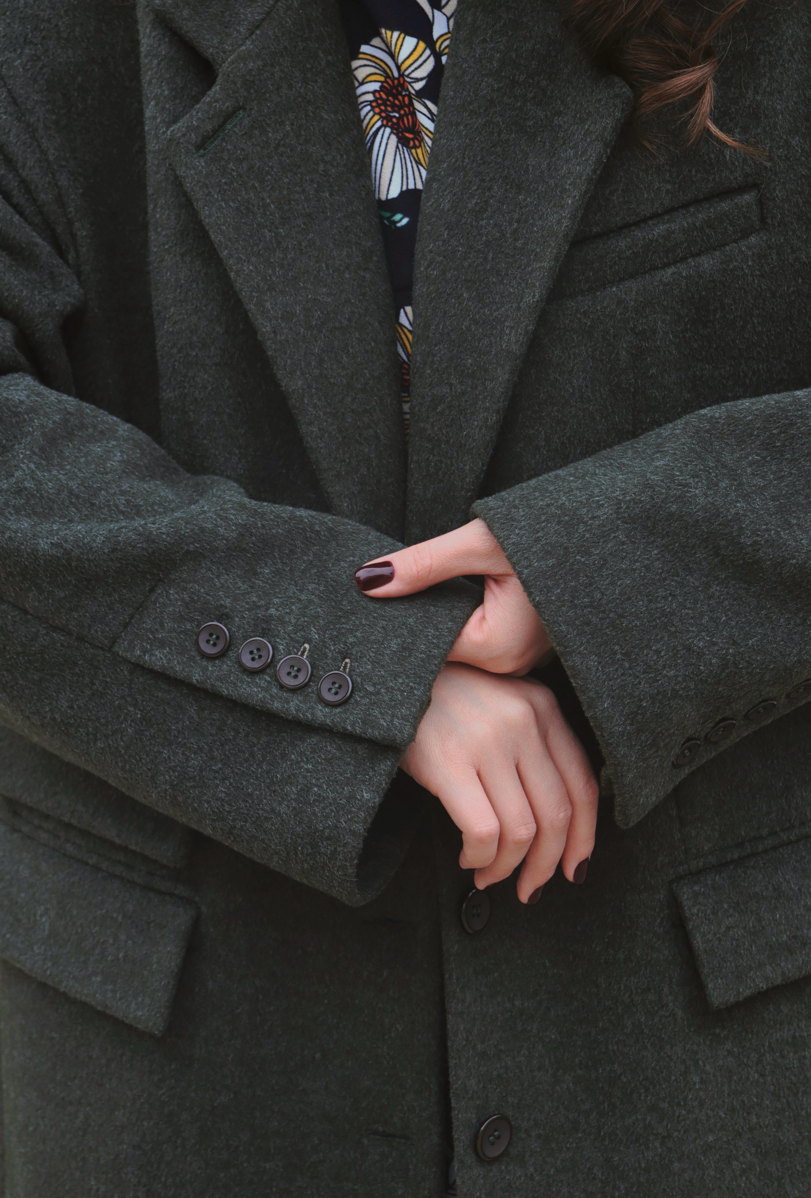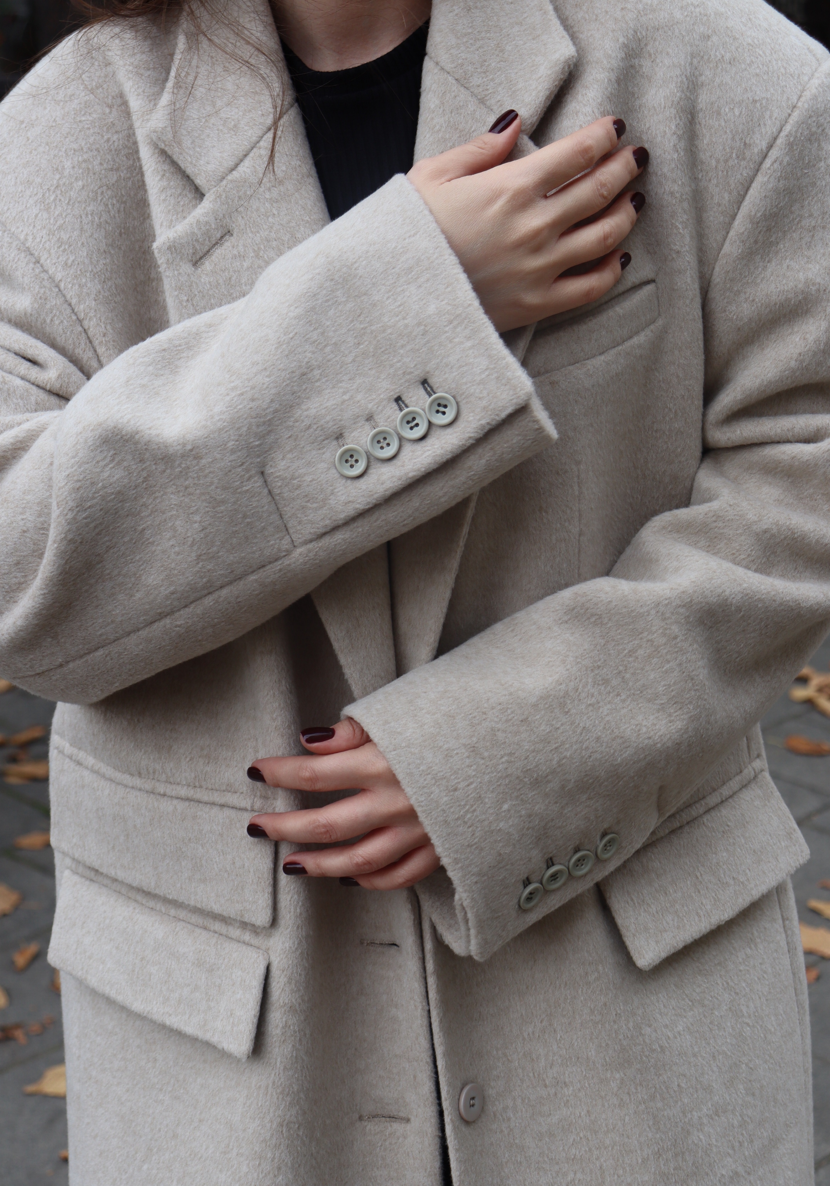 Ткань держит форму, при этом остается мягкой и пластичной. Детали — клапаны, аккуратные прорезные карманы, рукава с декоративными пуговицами — подчеркивают продуманность кроя и эстетику лаконичного стиля.