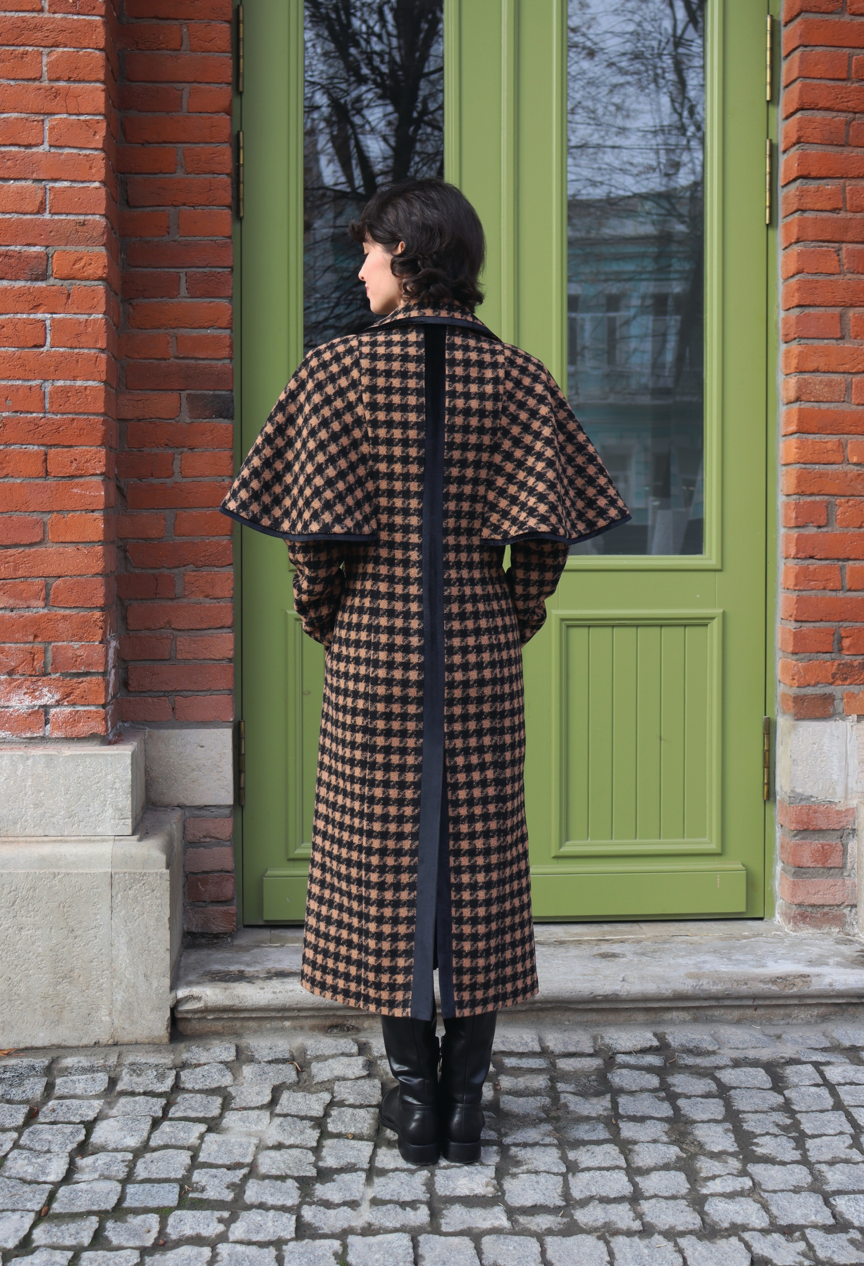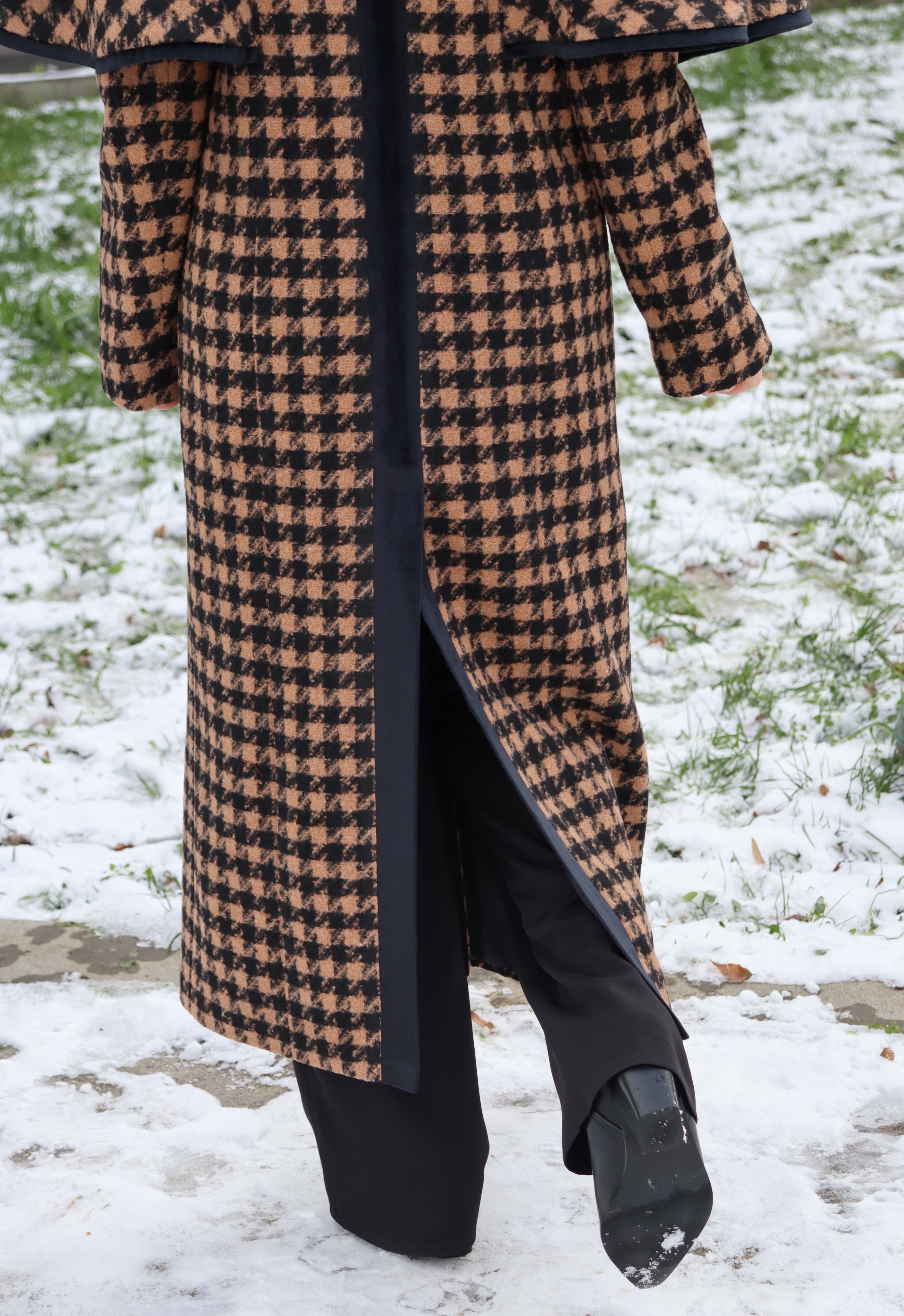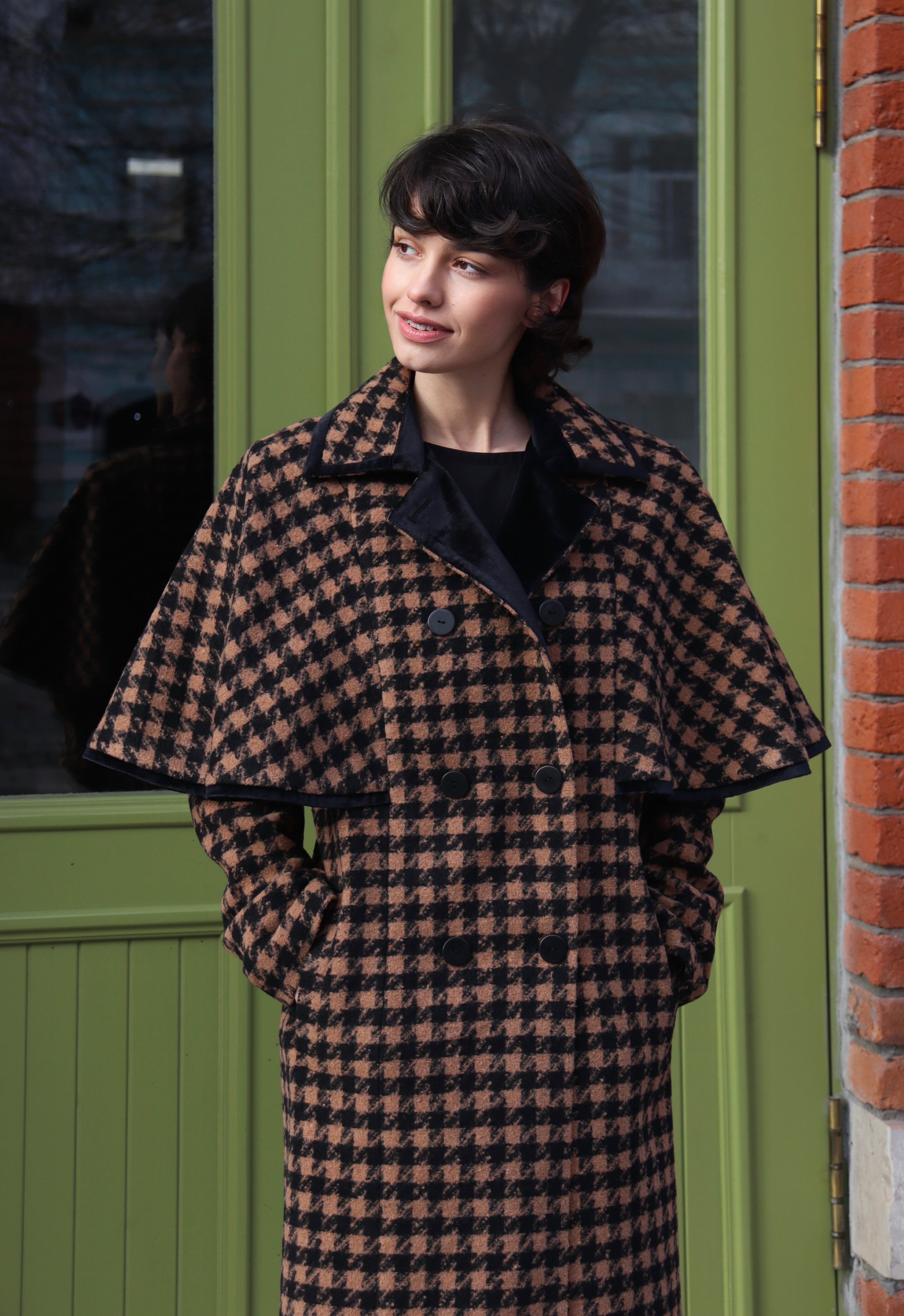 Элегантное двубортное пальто с кейпом — воплощение утончённого стиля и благородной классики. Модель выполнена в изысканном рисунке «гусиная лапка», который придаёт образу выразительность и актуальность вне времени. Кейп добавляет силуэту драматичности и подчёркивает статусный характер изделия.