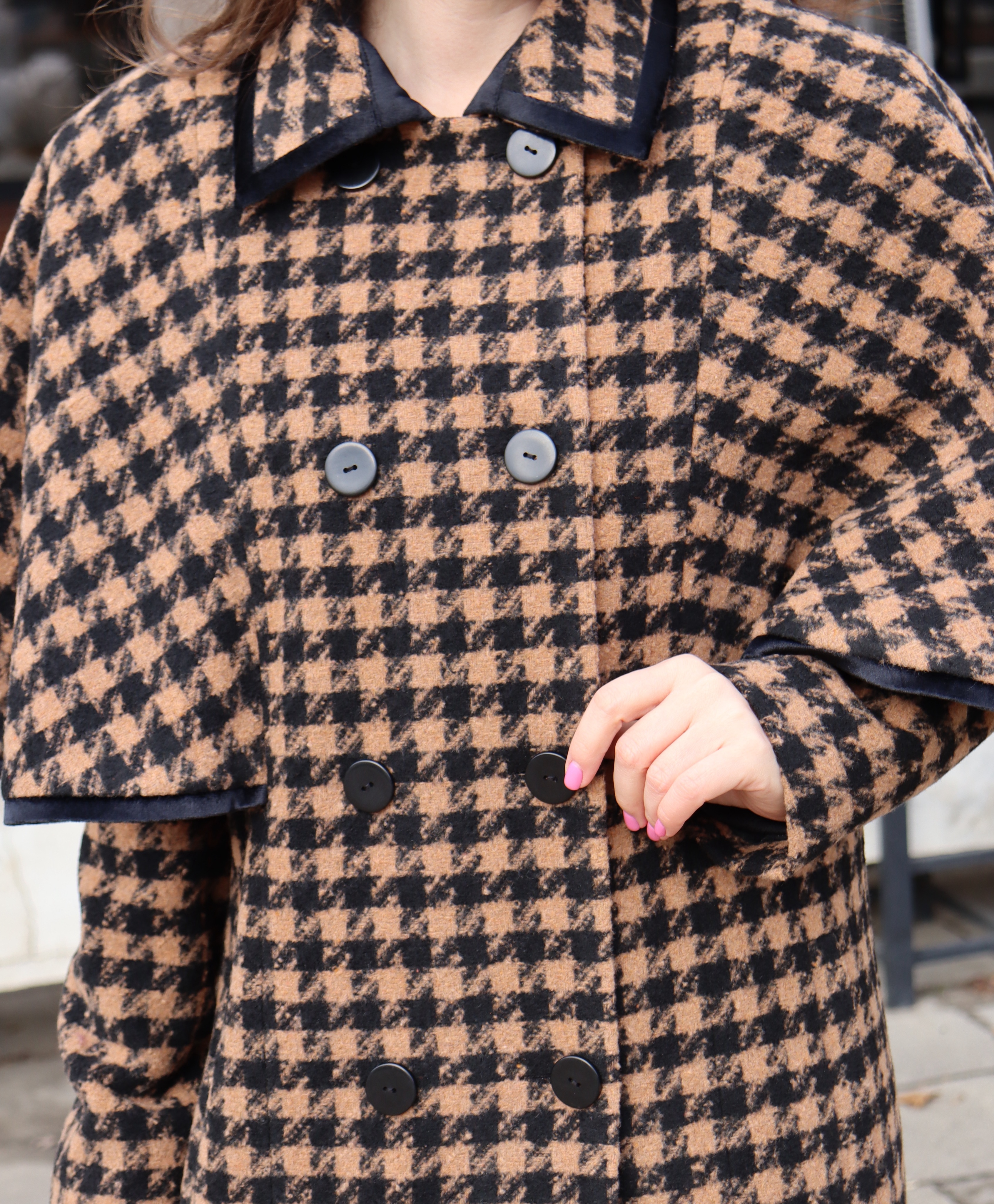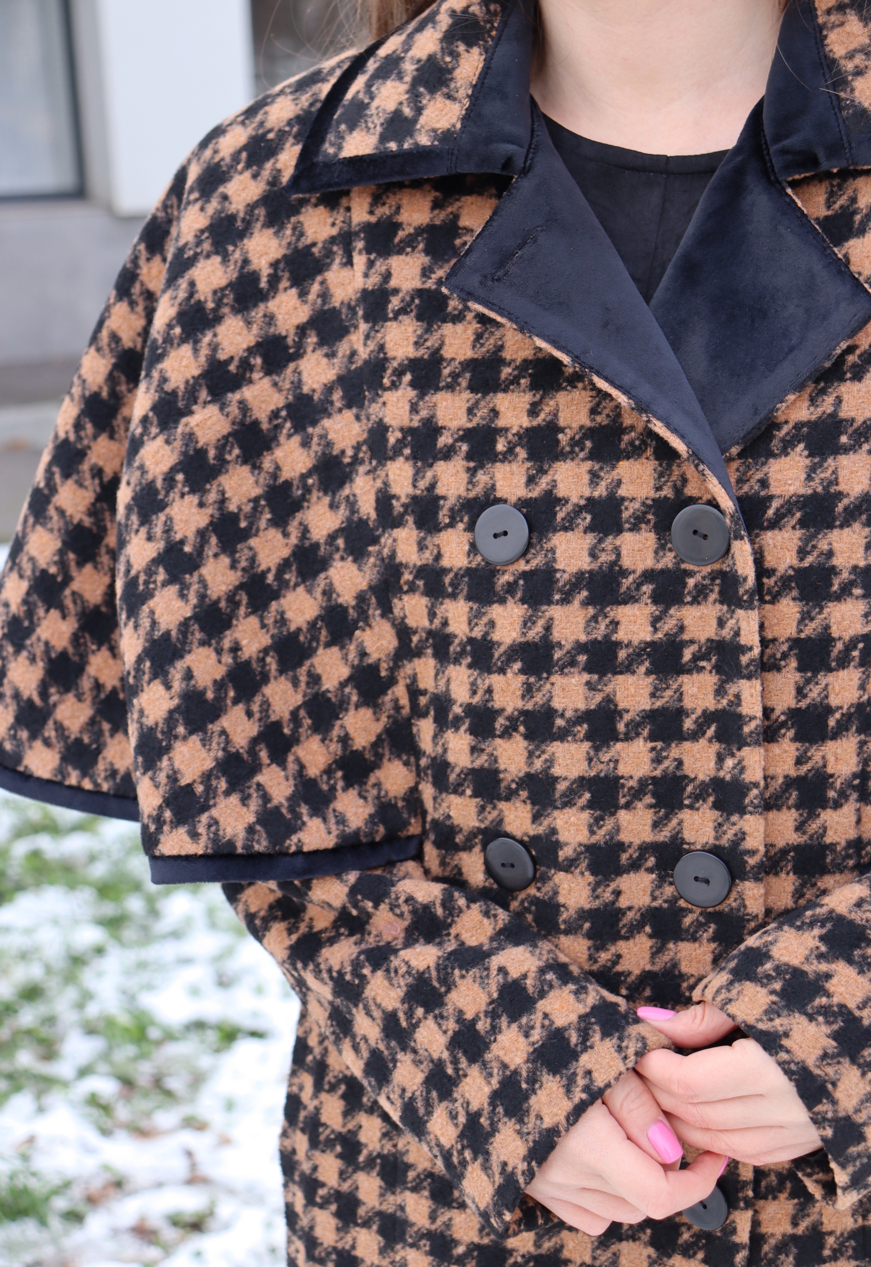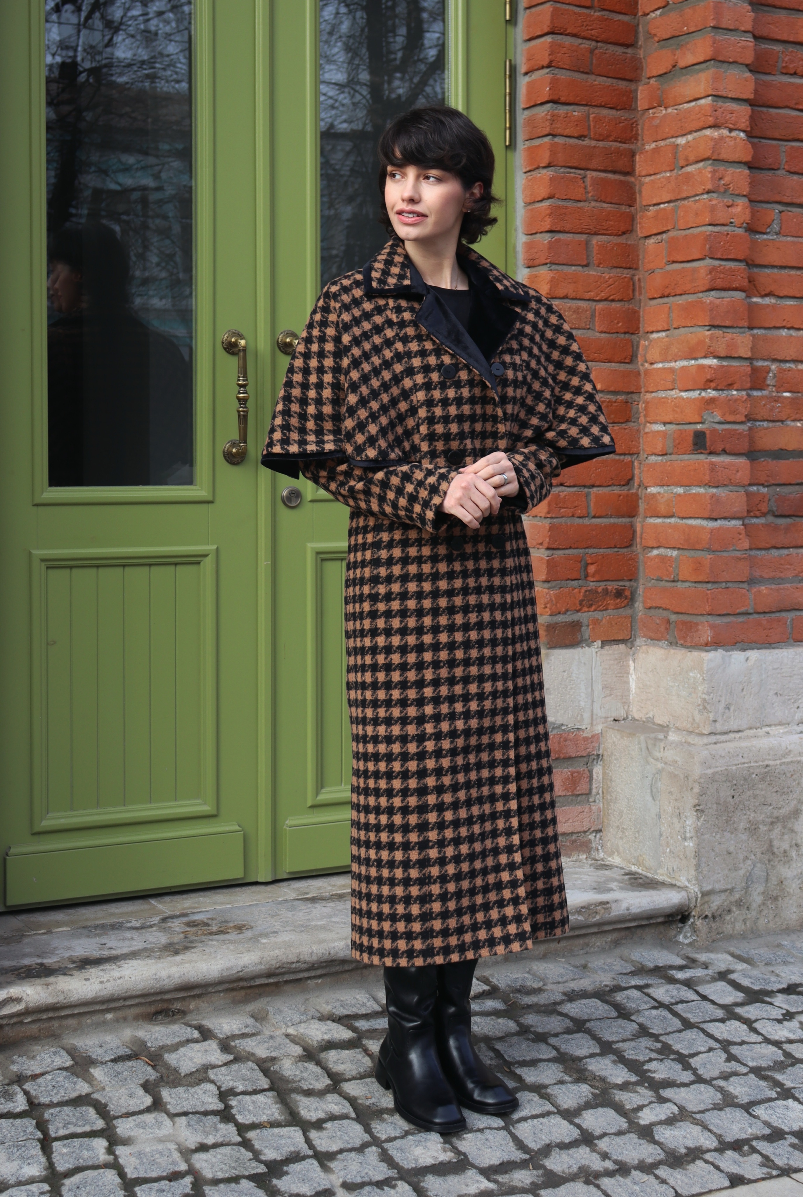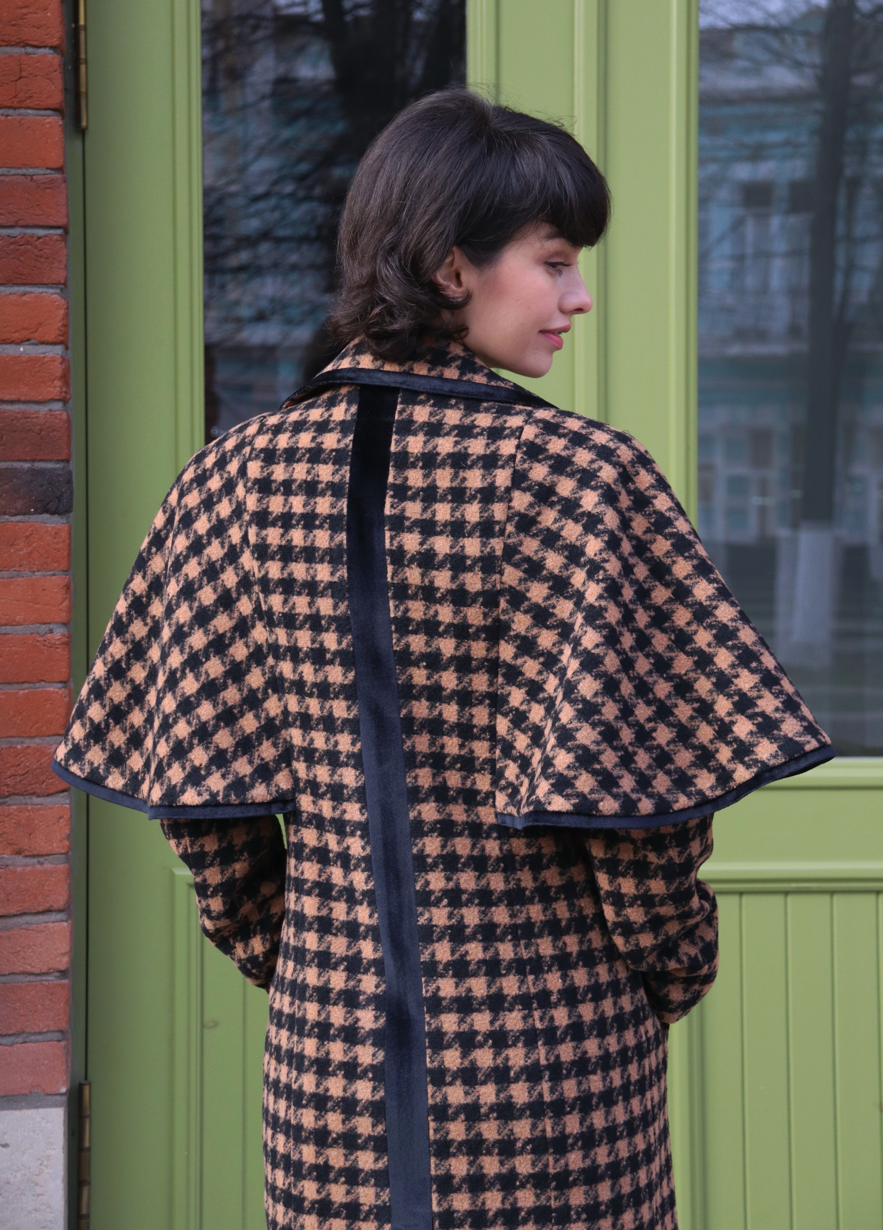 Элегантное двубортное пальто с кейпом — воплощение утончённого стиля и благородной классики. Модель выполнена в изысканном рисунке «гусиная лапка», который придаёт образу выразительность и актуальность вне времени. Кейп добавляет силуэту драматичности и подчёркивает статусный характер изделия.