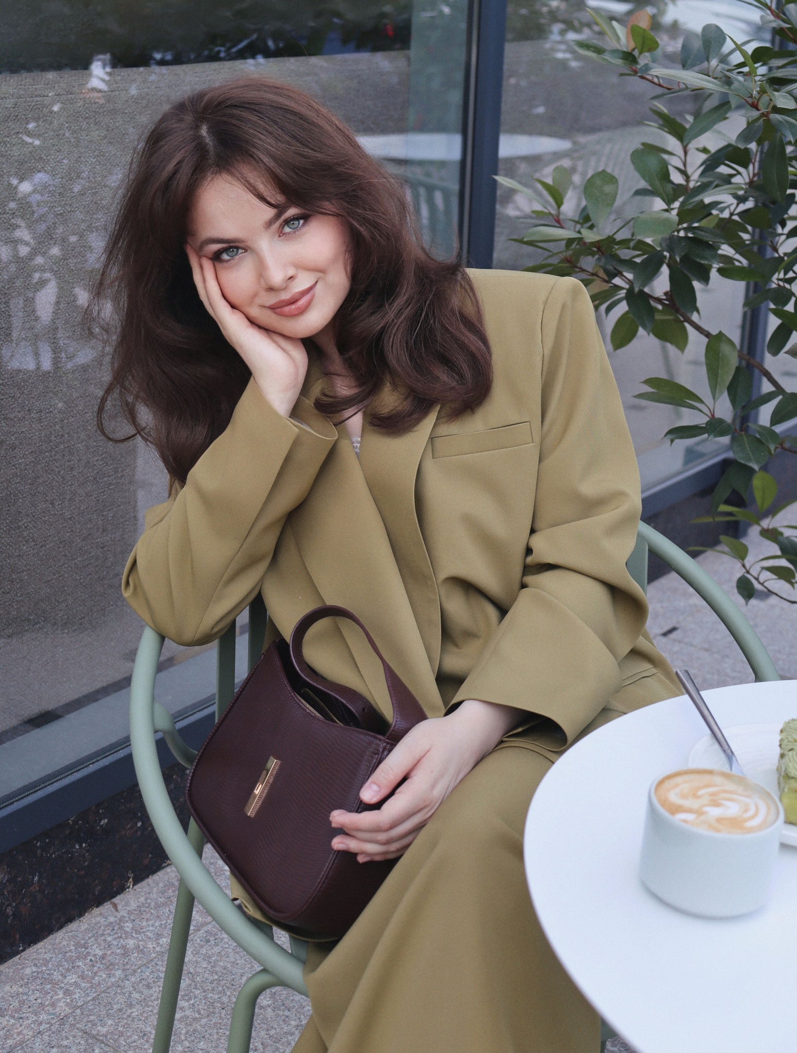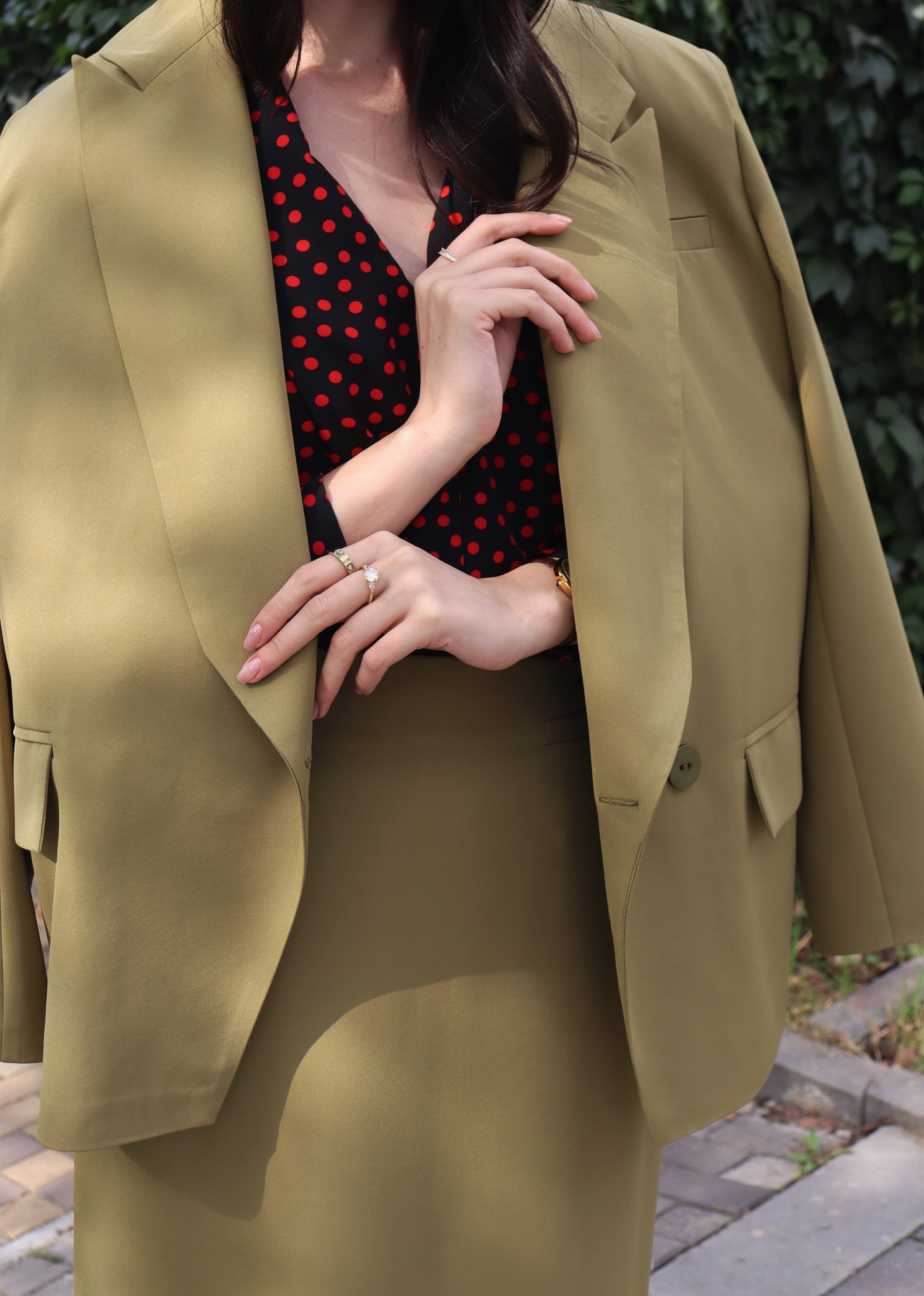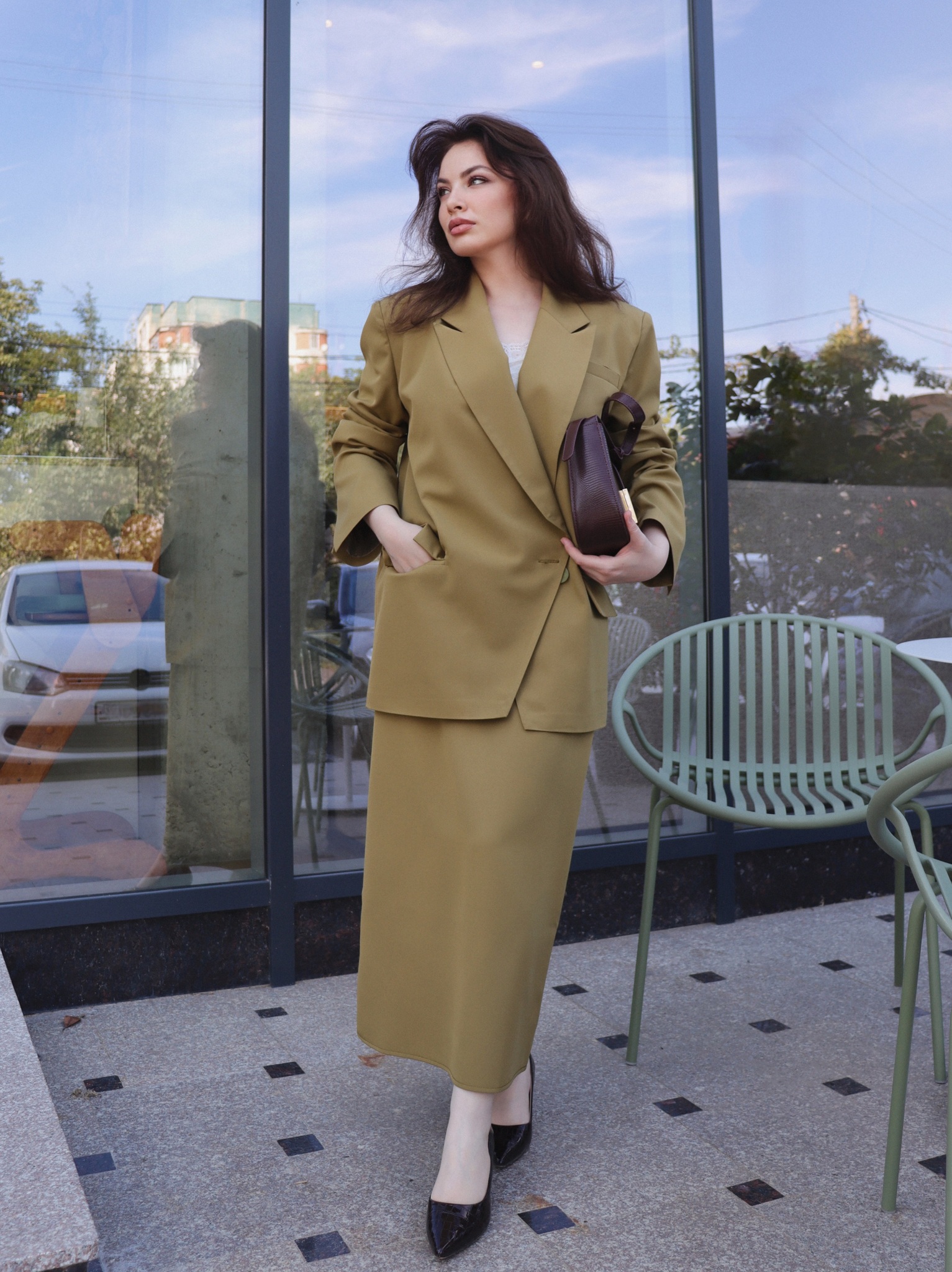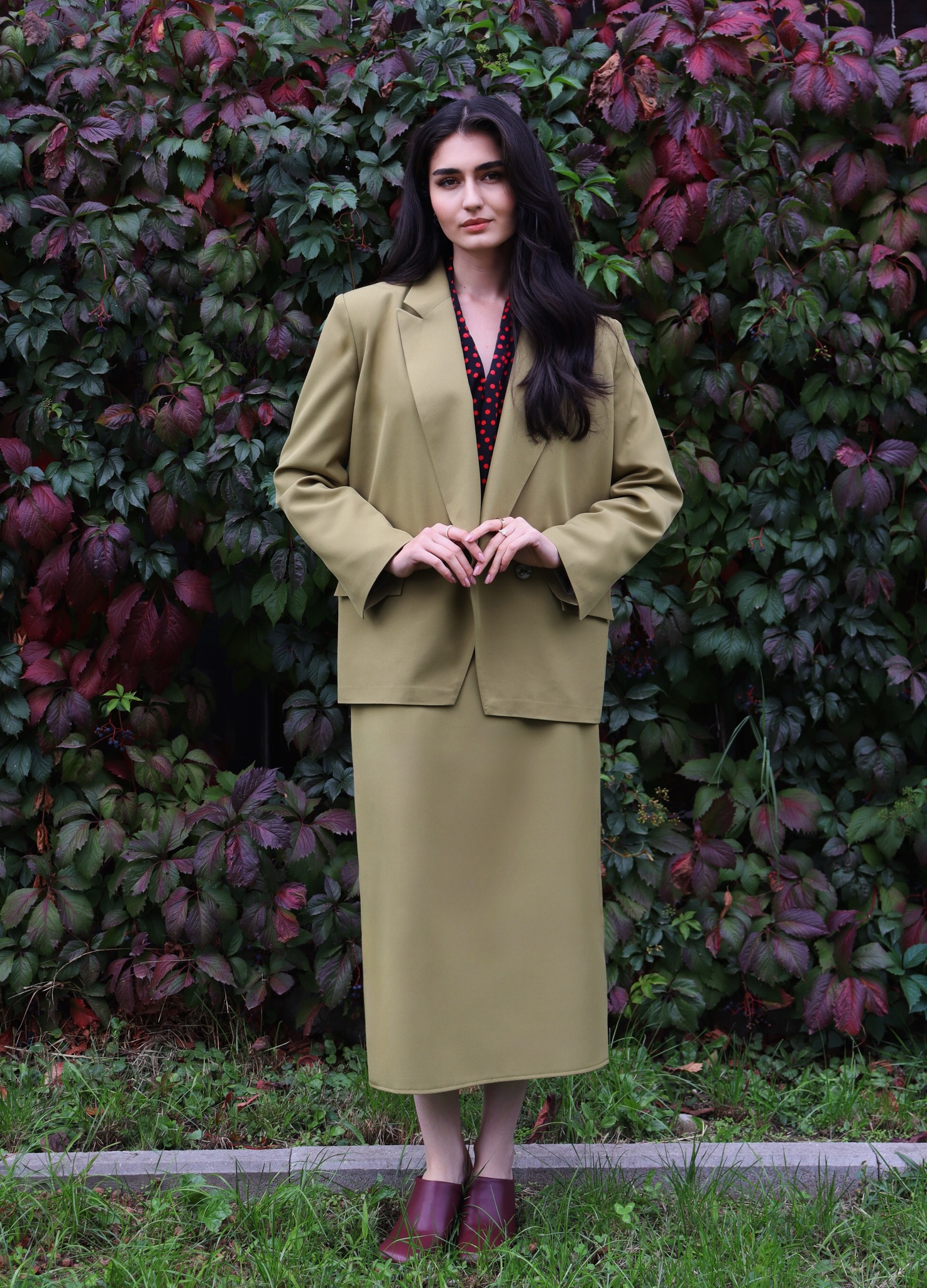 Однобортный пиджак прямого кроя с расширенной линией плеч. Подплечники. Воротник с отложными лацканами. Застежка на пуговицу. Прорезные карманы-клапаны. Рукав со шлицей. Шлица на спинке для свободы движения.