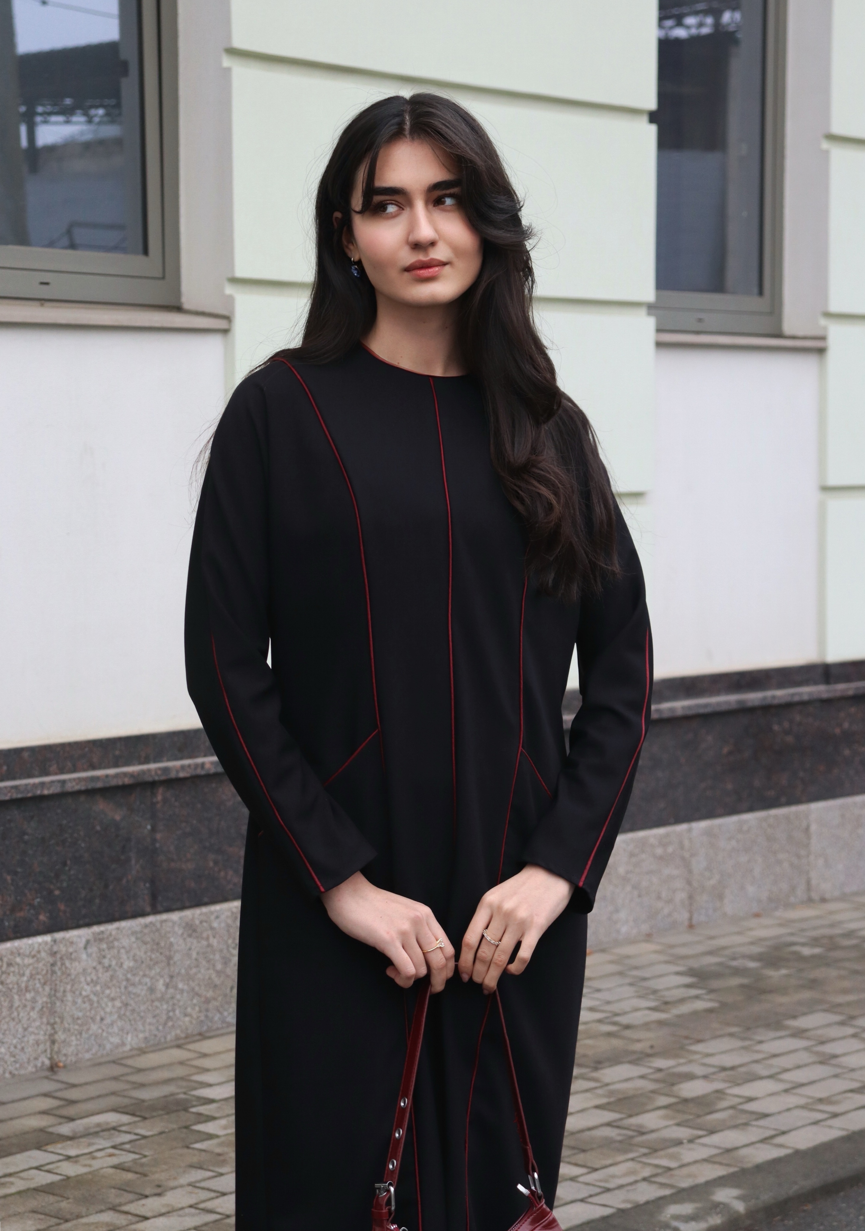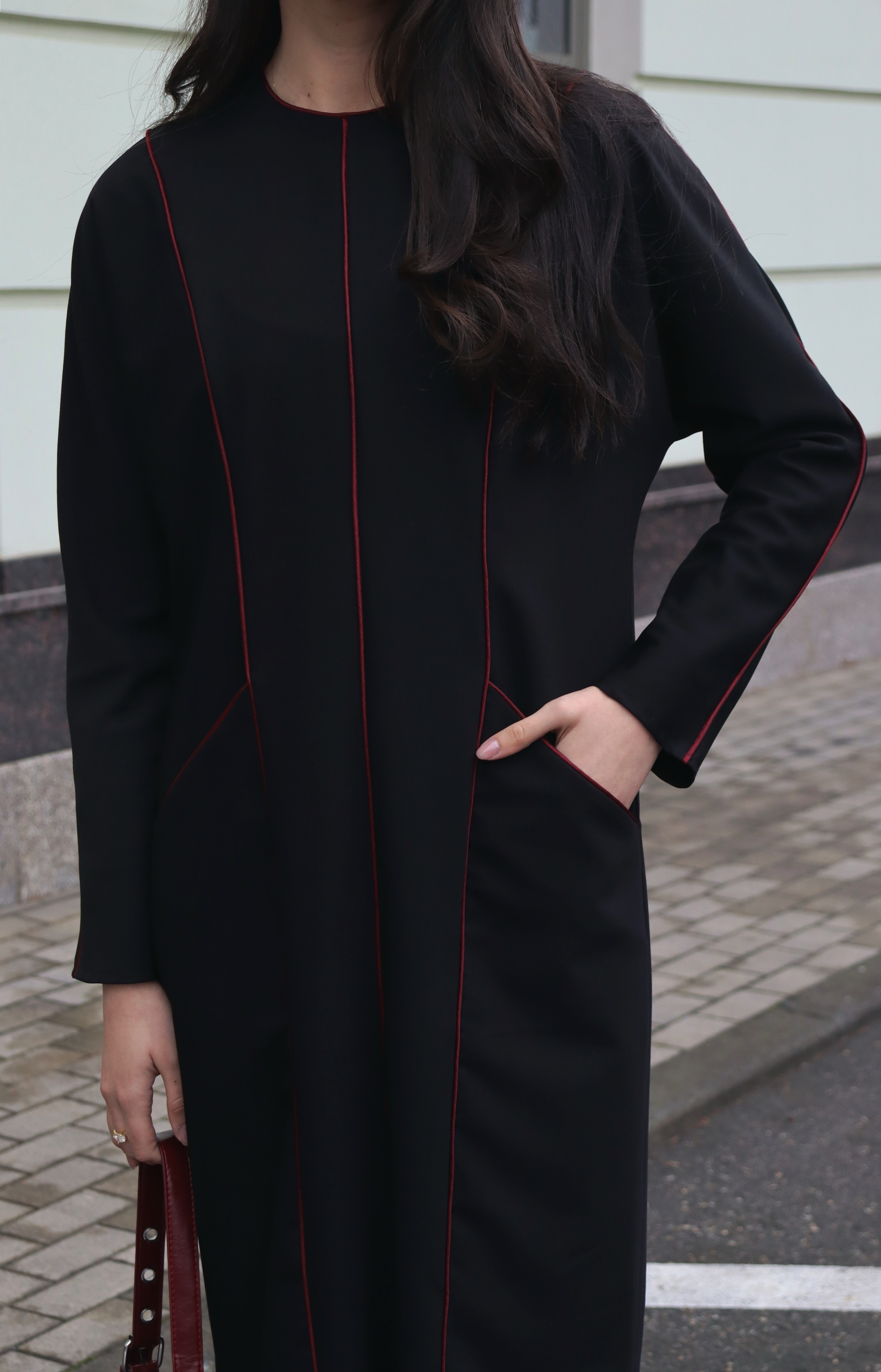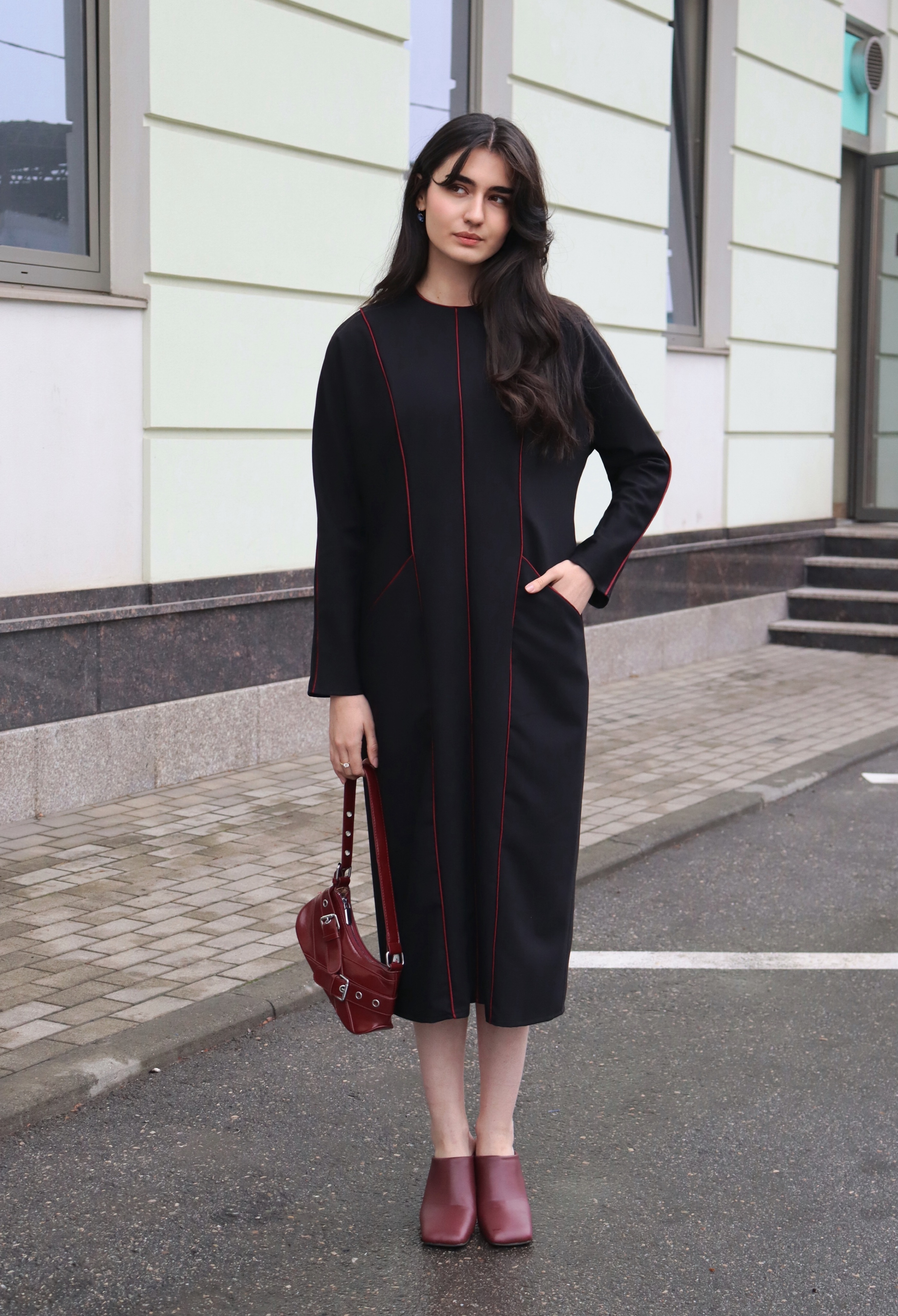 Платье-футляр MAKTUB с контрастным кантом — лаконичное, собранное и при этом очень выразительное. Вертикальные линии визуально вытягивают силуэт, делают его стройнее и подчёркивают аккуратную архитектуру кроя.