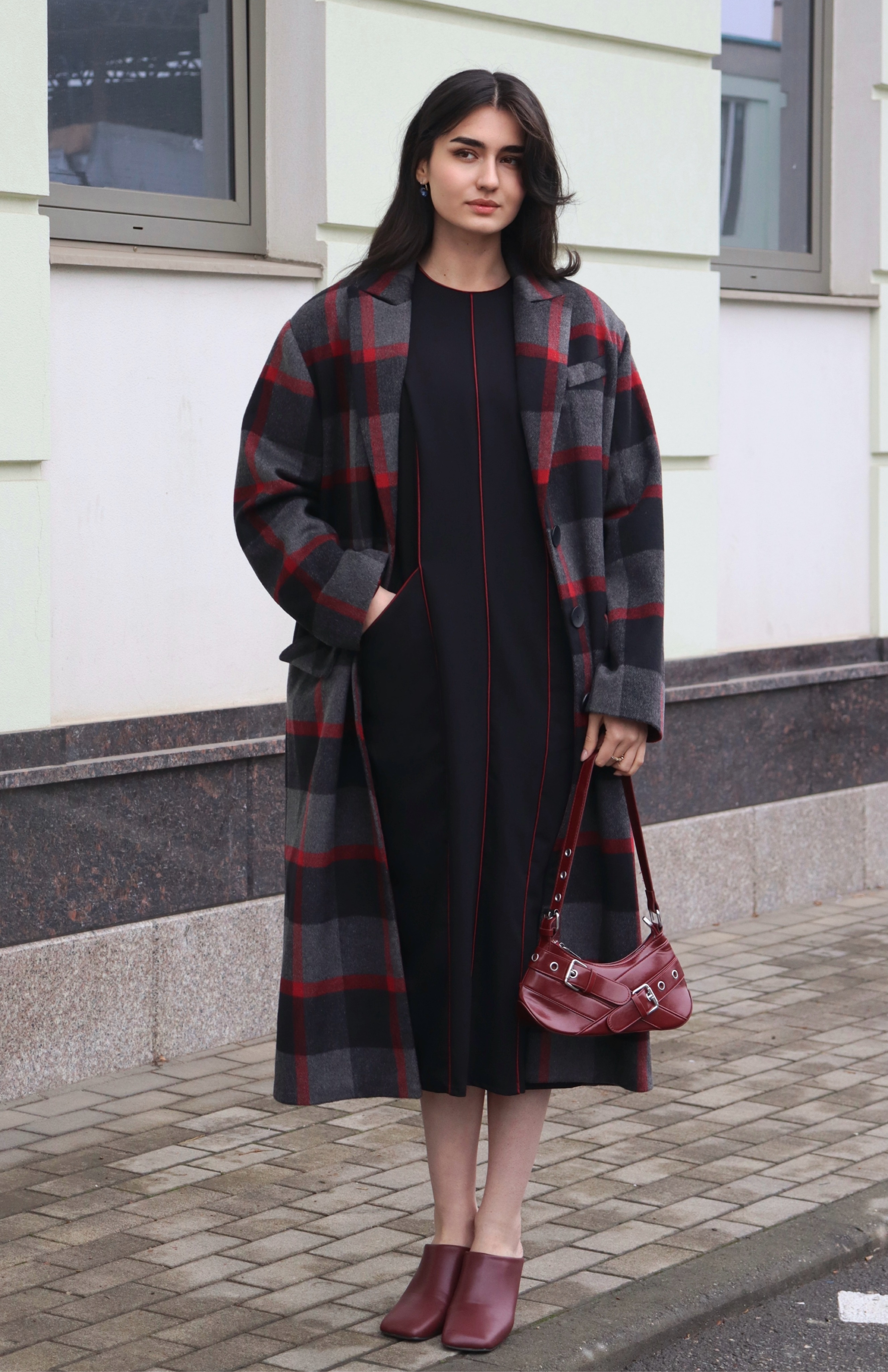 Мягкая ткань комфортно садится по фигуре, не стесняя движения и оставаясь строгой в нужной мере. Контрастный кант работает как тонкий графичный акцент — не кричащий, но запоминающийся.