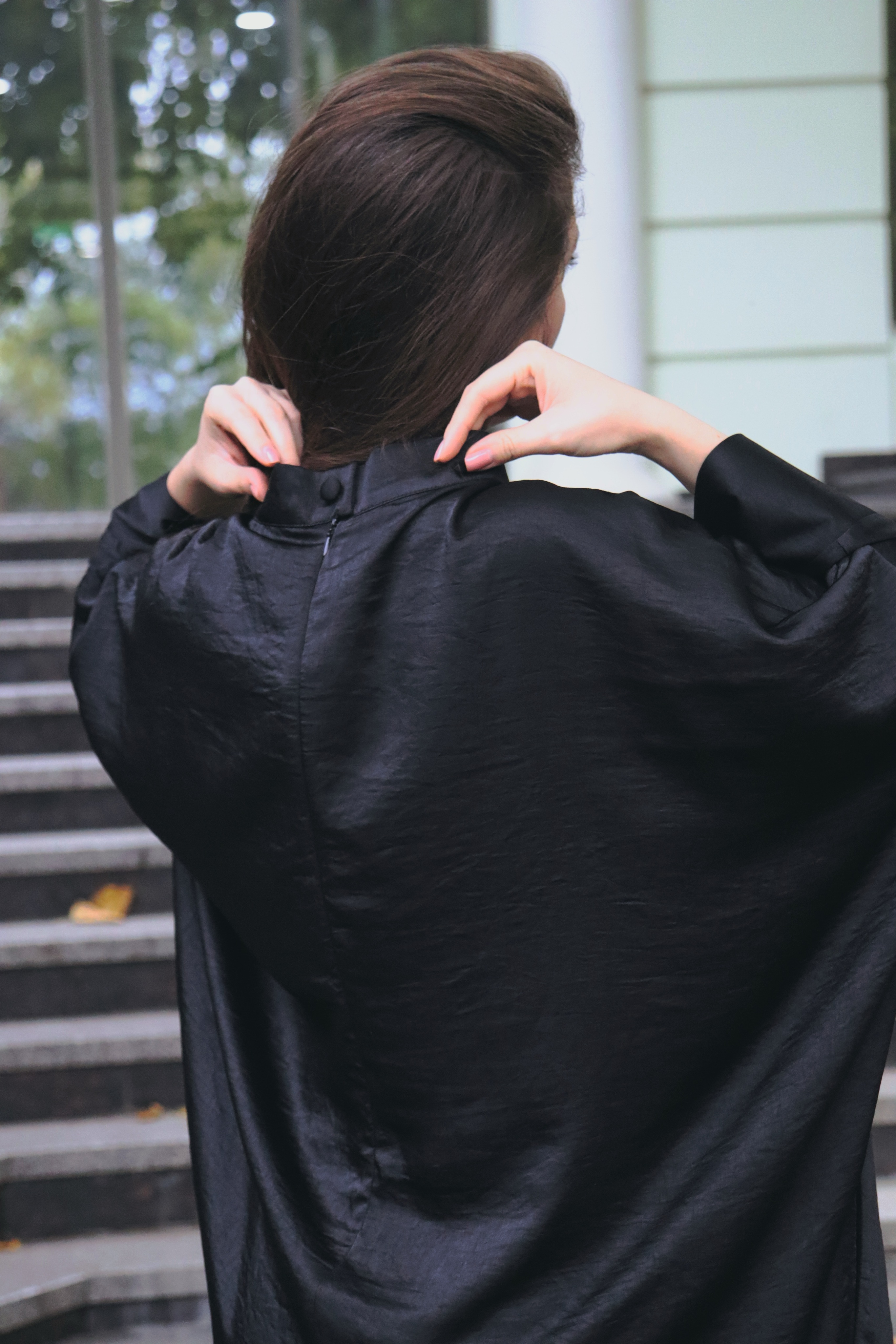 Созданное в духе минимализма, оно говорит через детали: мягкая драпировка, свободный прямой силуэт, скрытые застёжки и воротник стойка. Здесь нет ничего лишнего — и в этом его главная сила. Плотная, слегка фактурная ткань держит форму, не теряя мягкости.