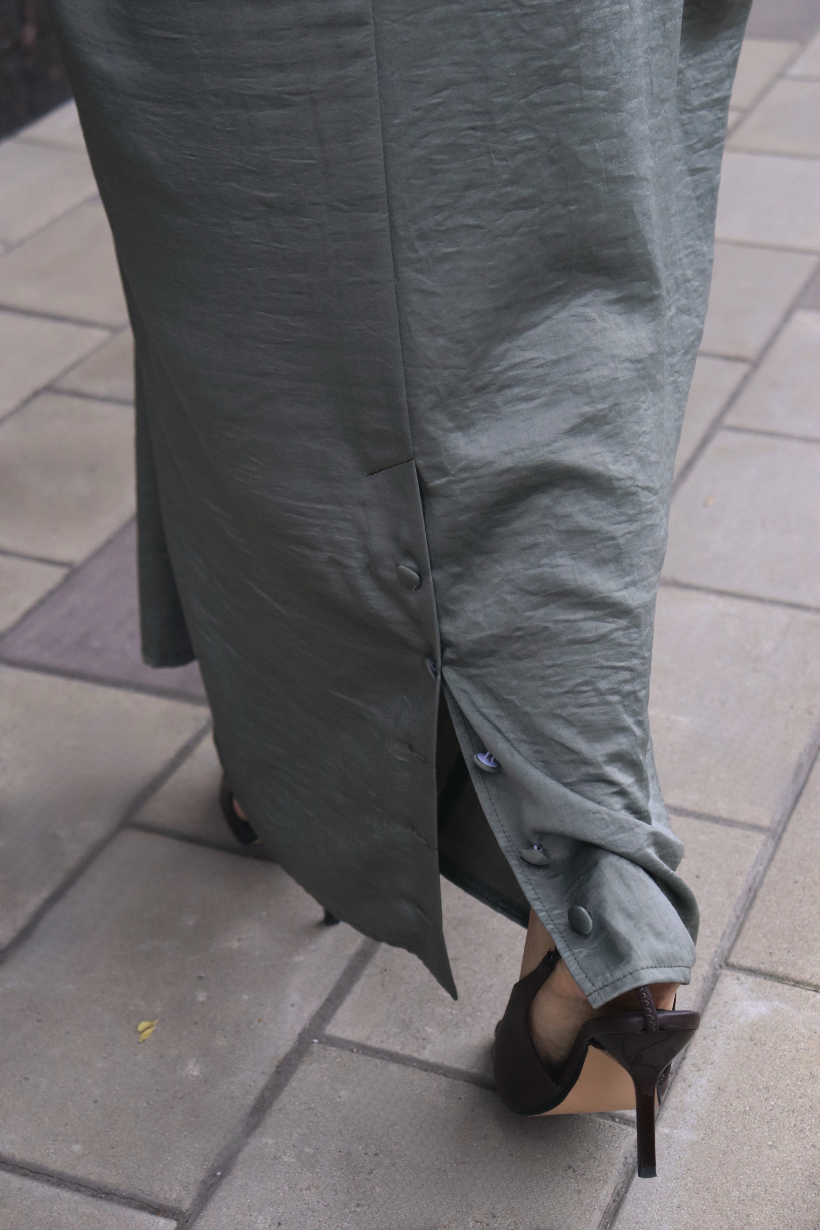 Она красиво «скользит» при движении, подчёркивая, но не обнажая. А продуманные разрезы и пуговицы внизу добавляют акцента в нужный момент — когда ты этого захочешь. Платье подходит для любого типа фигуры, скрывает и подчёркивает одновременно.