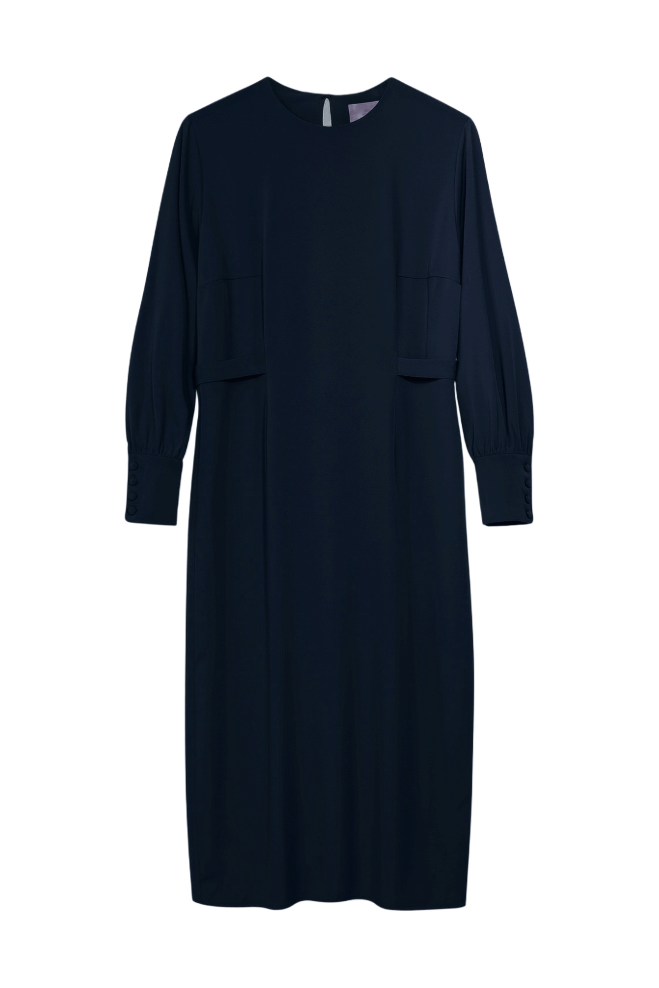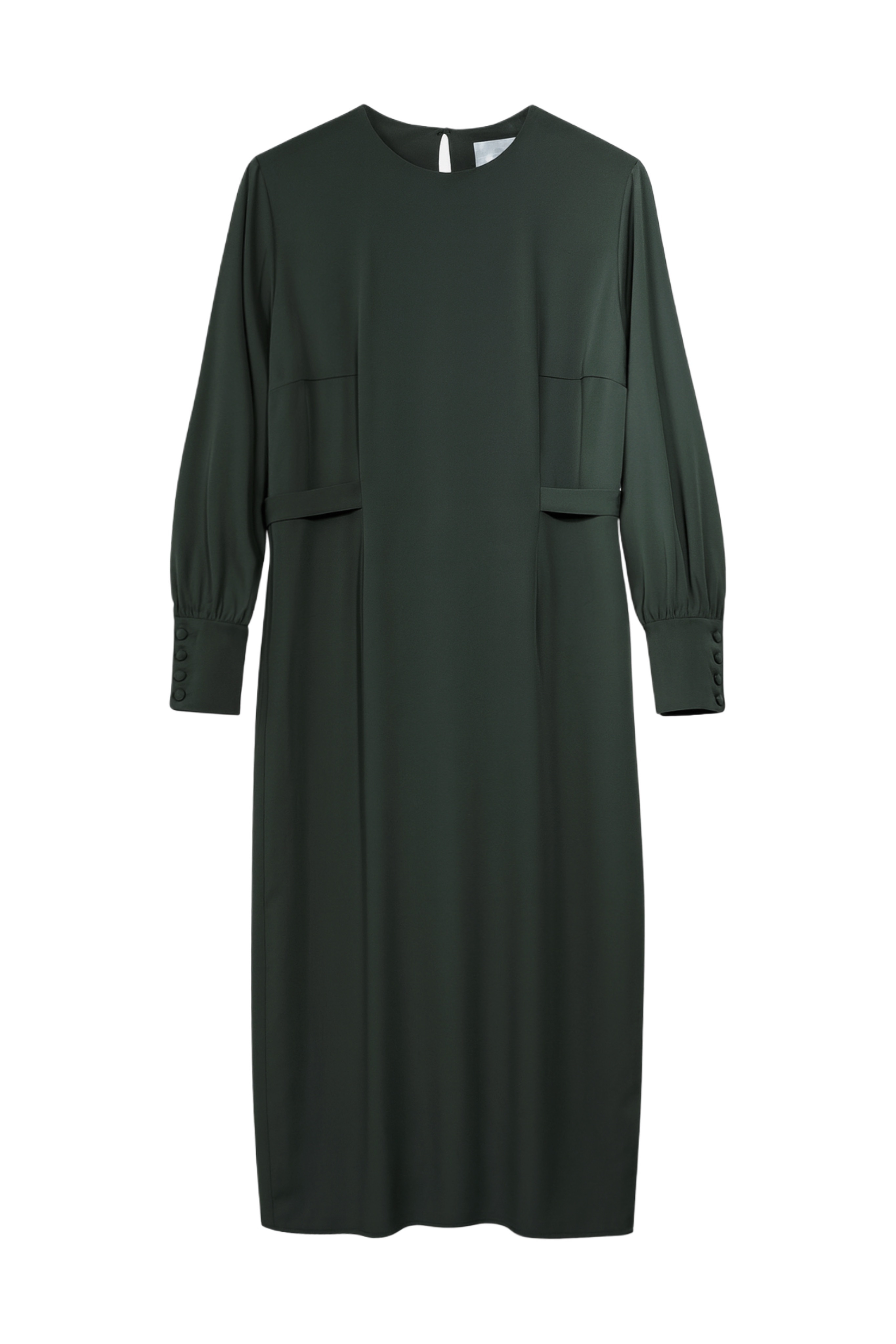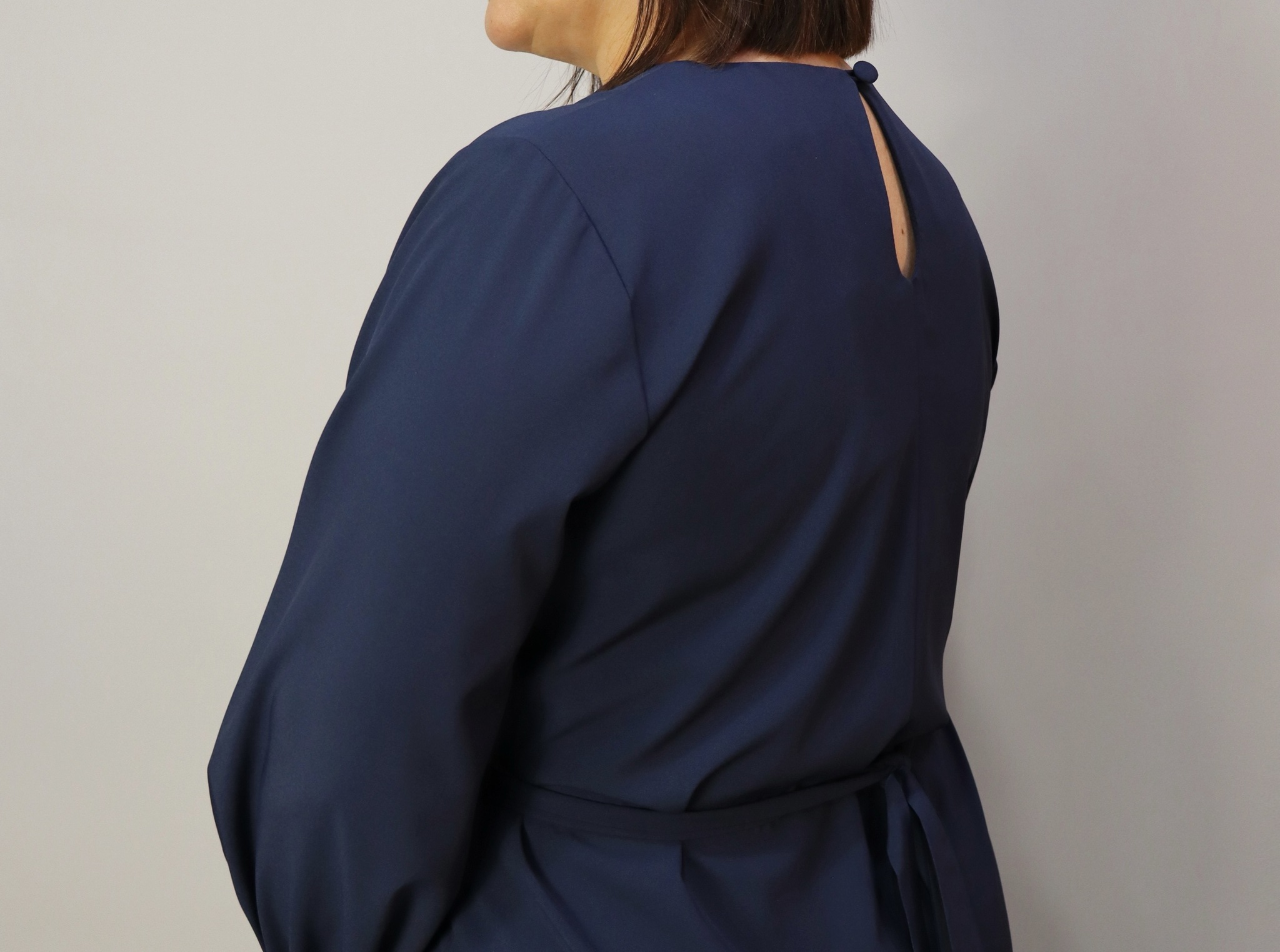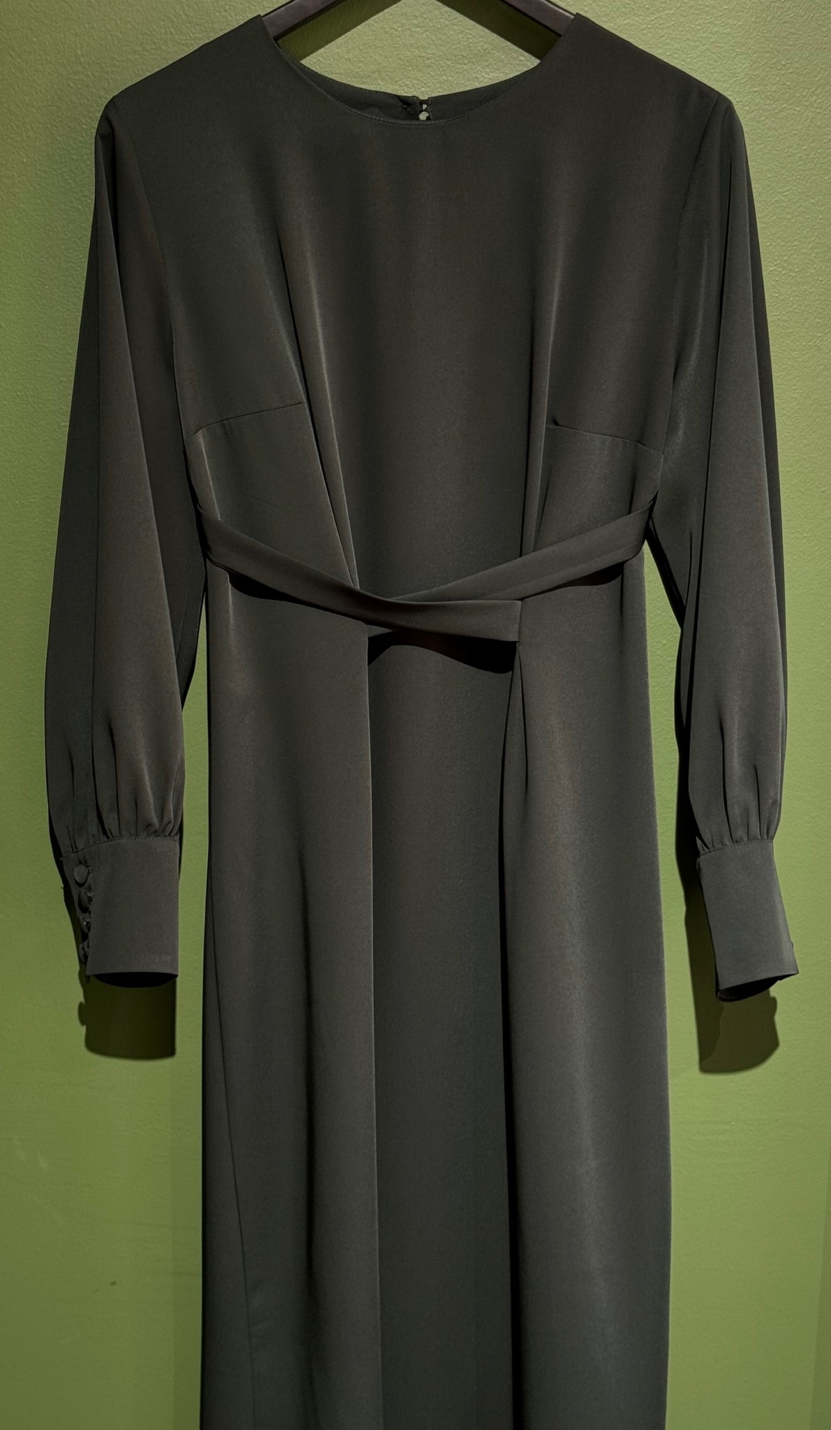Платье прямого кроя с разрезом сзади. Застежка на спине на пуговицу. Рукава со сборкой на высоком манжете. На талии вшитые пояса.