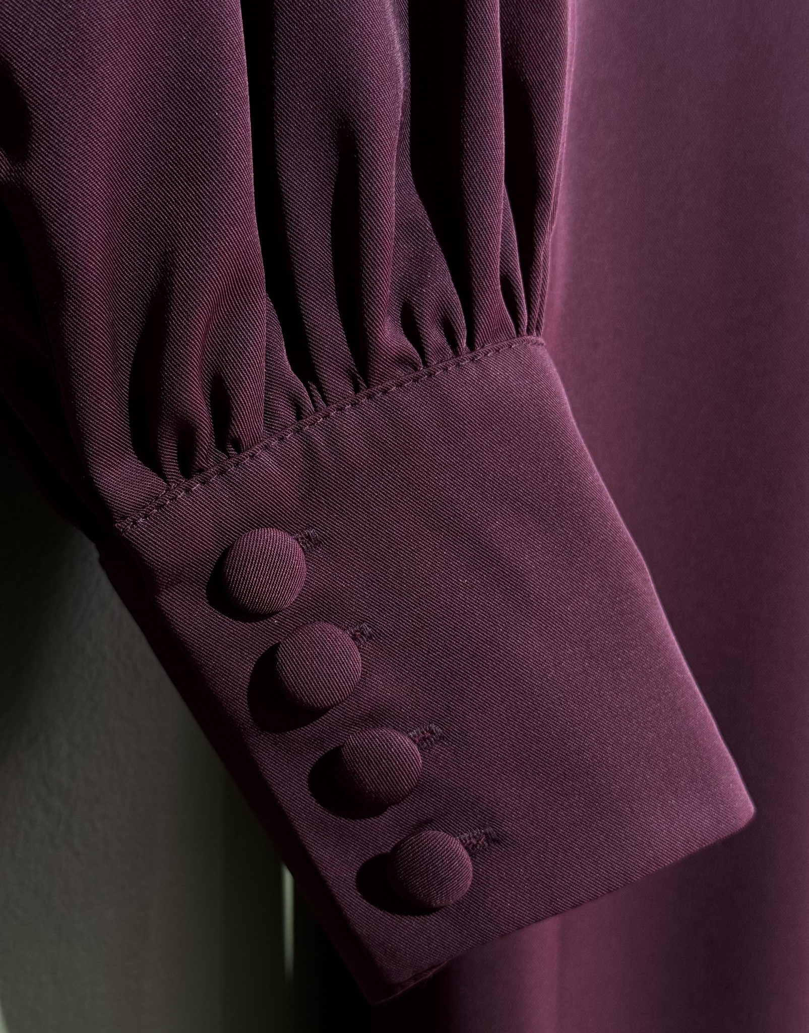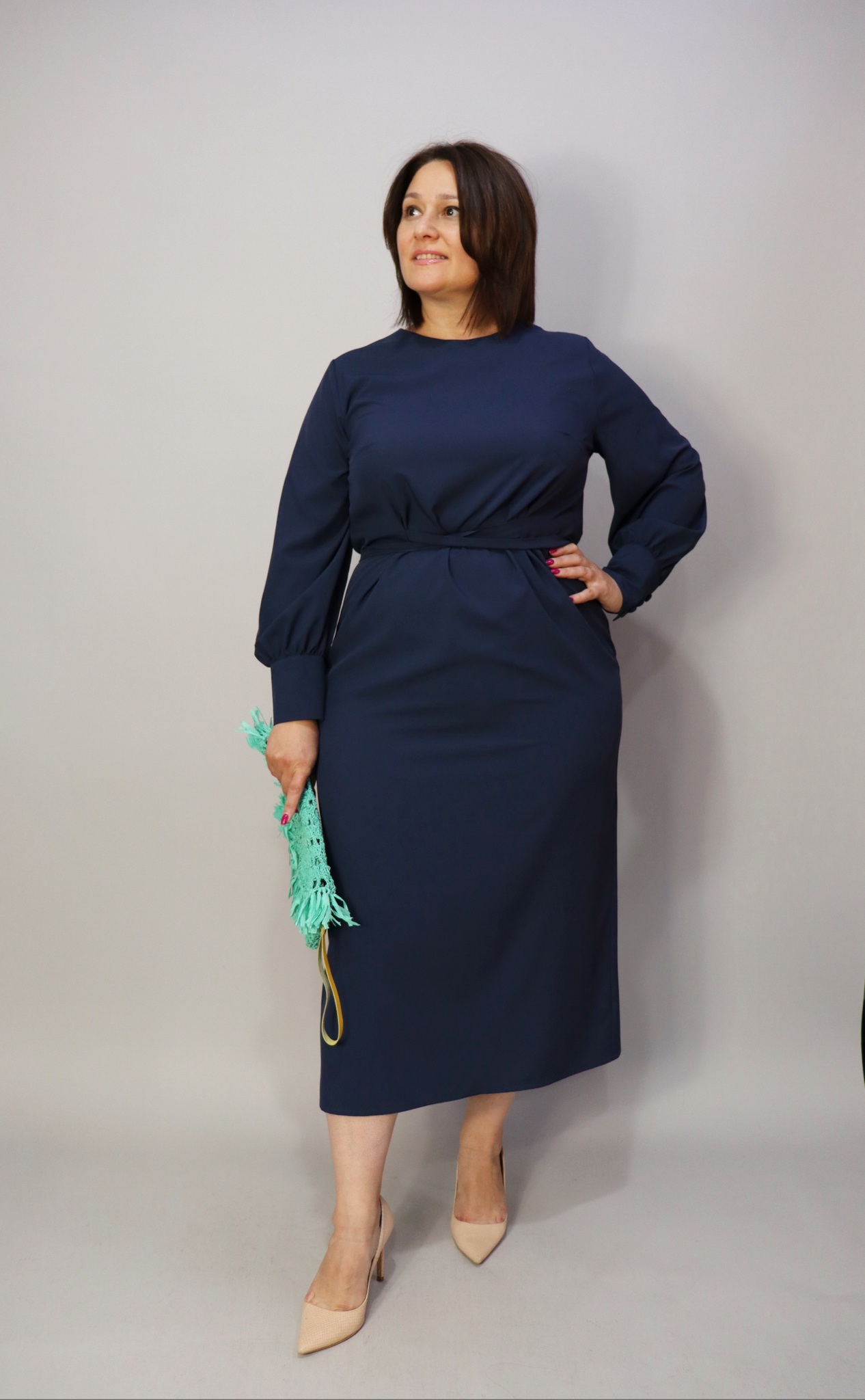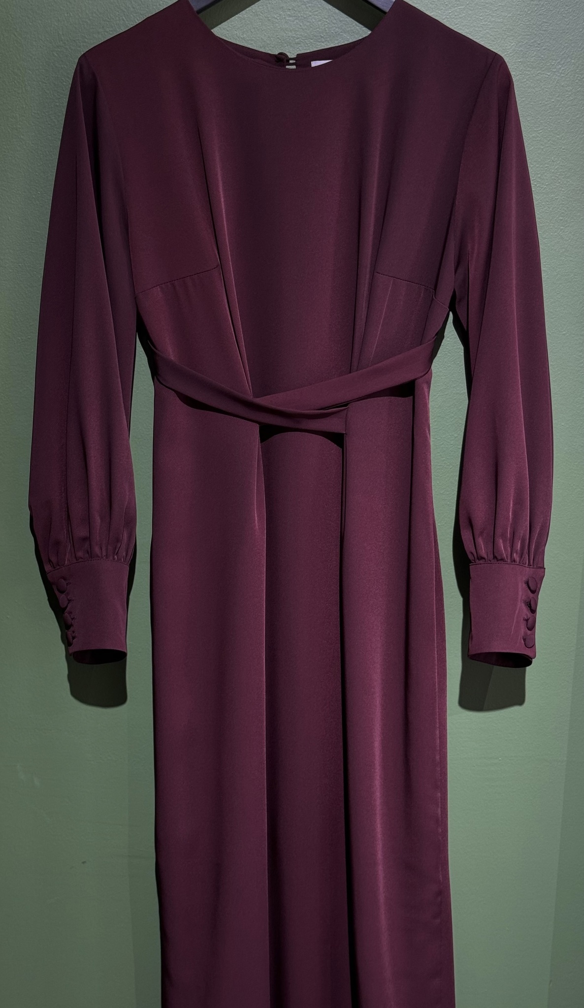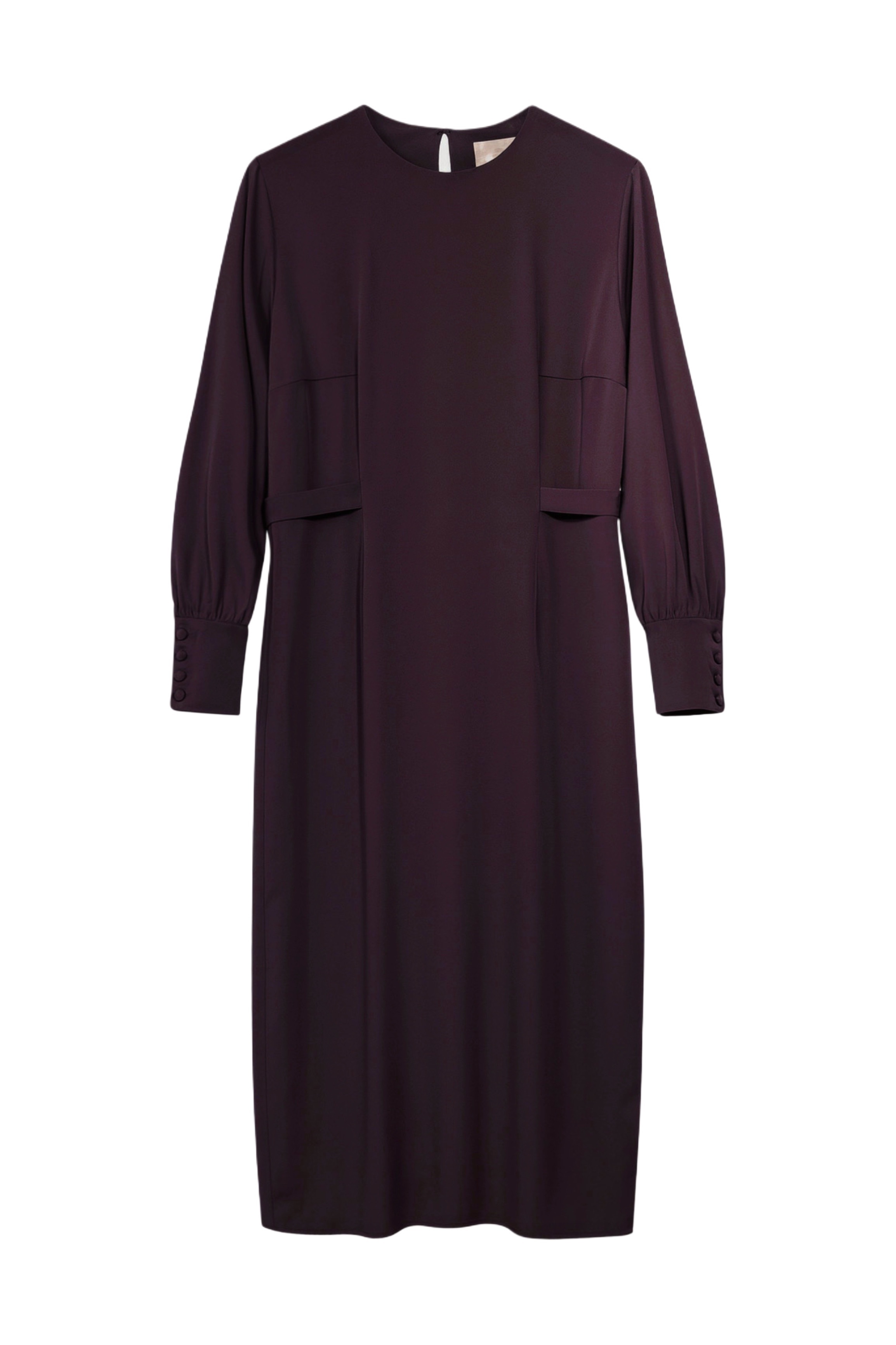 Платье прямого кроя с разрезом сзади. Застежка на спине на пуговицу. Рукава со сборкой на высоком манжете. На талии вшитые пояса.