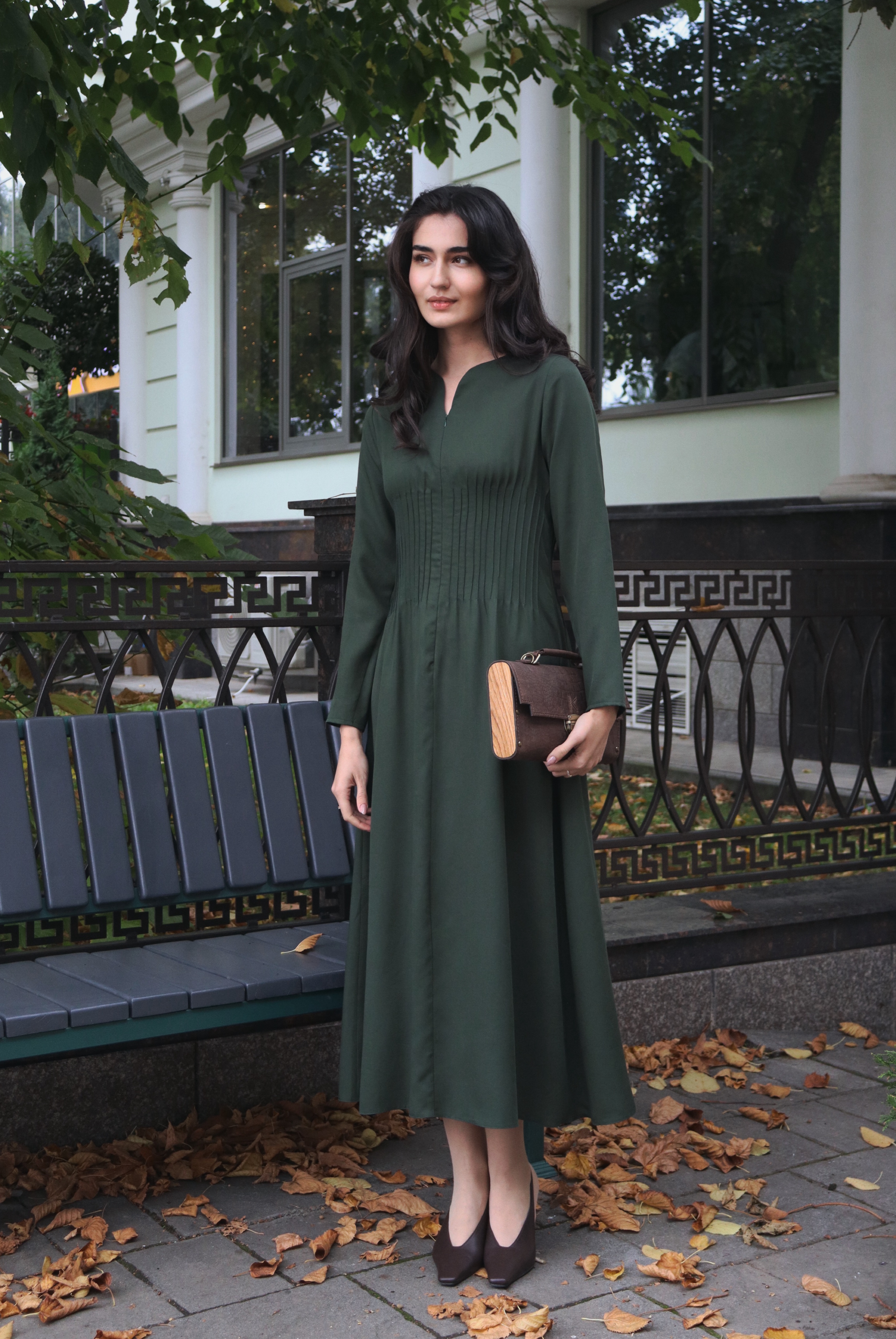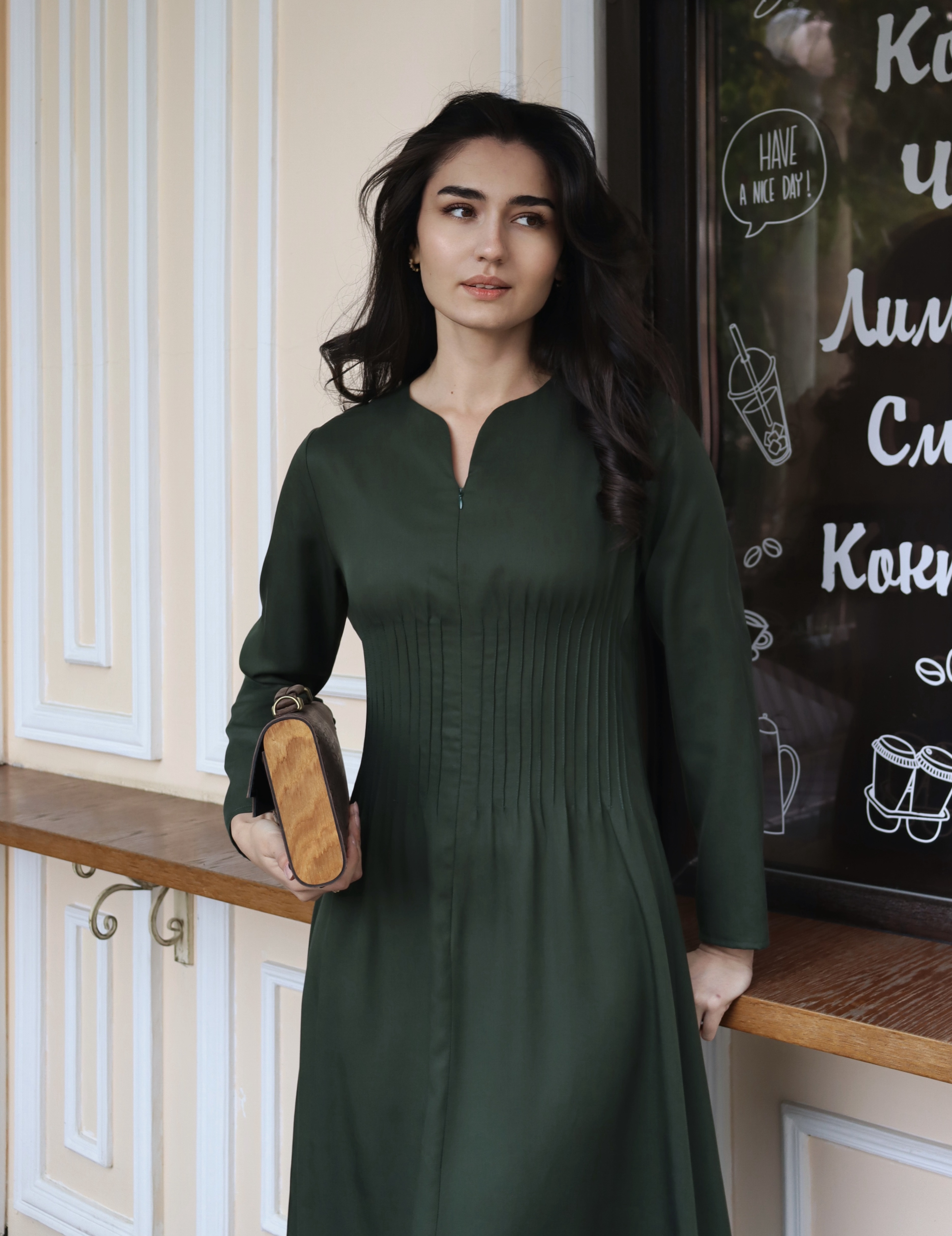 Оригинальный вырез-капля у горловины, длинный рукав и длина миди — идеальный баланс женственности и сдержанности.