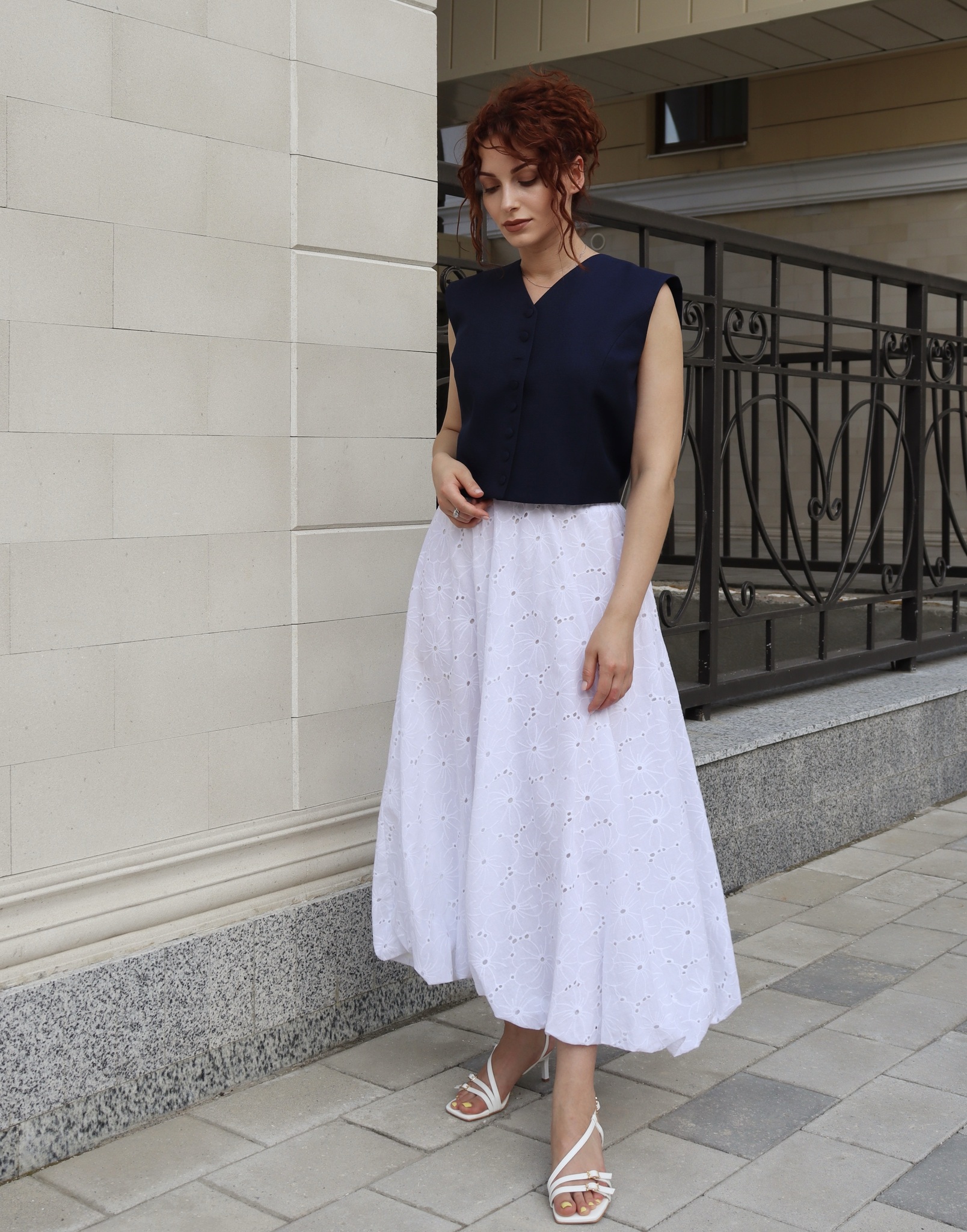 Объемная юбка баллон в длине миди из шитья. На подкладе. Пояс на резинке. Отлично встраивается в любой гардероб, будь он базовый, спортивный или вечерний.