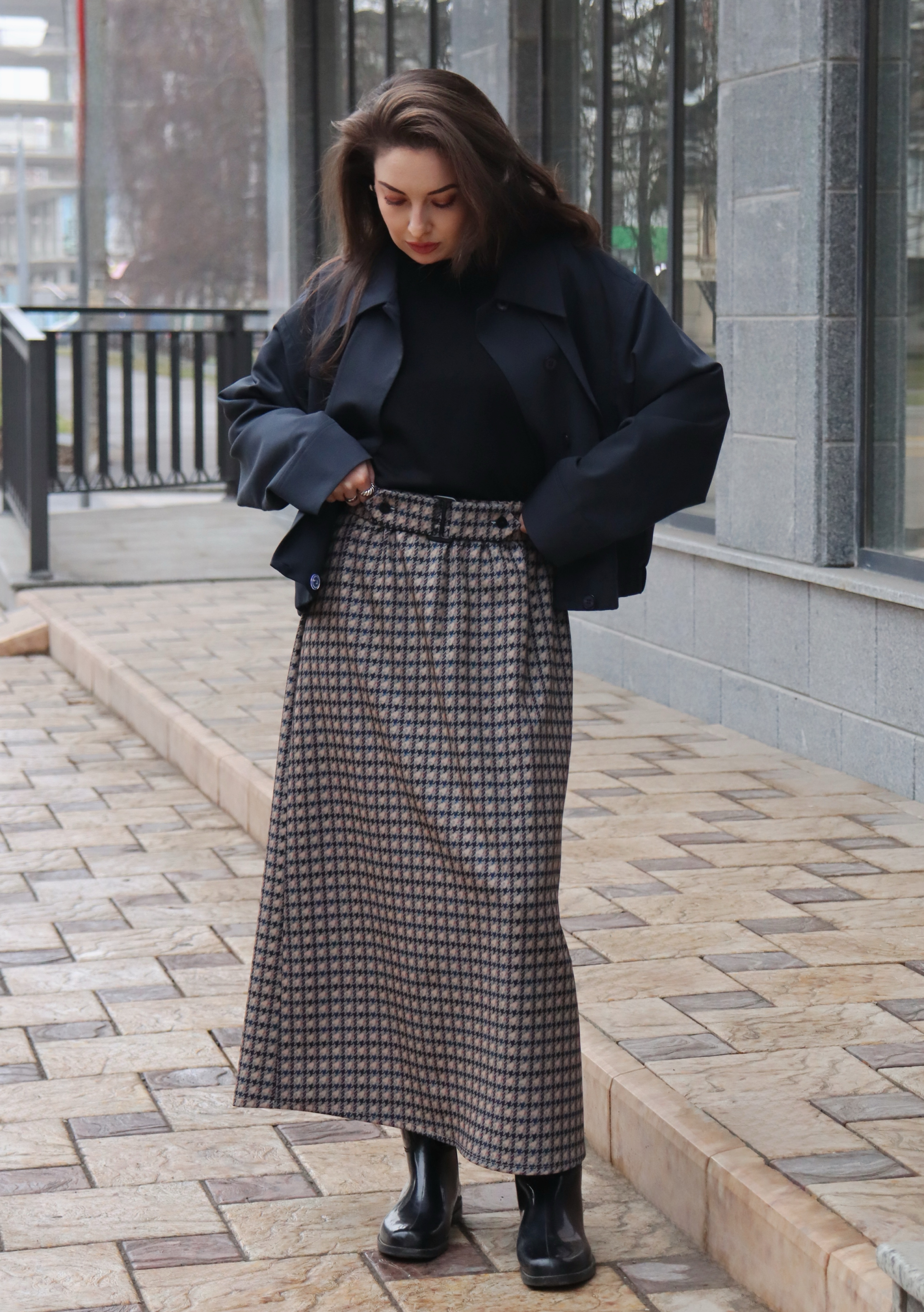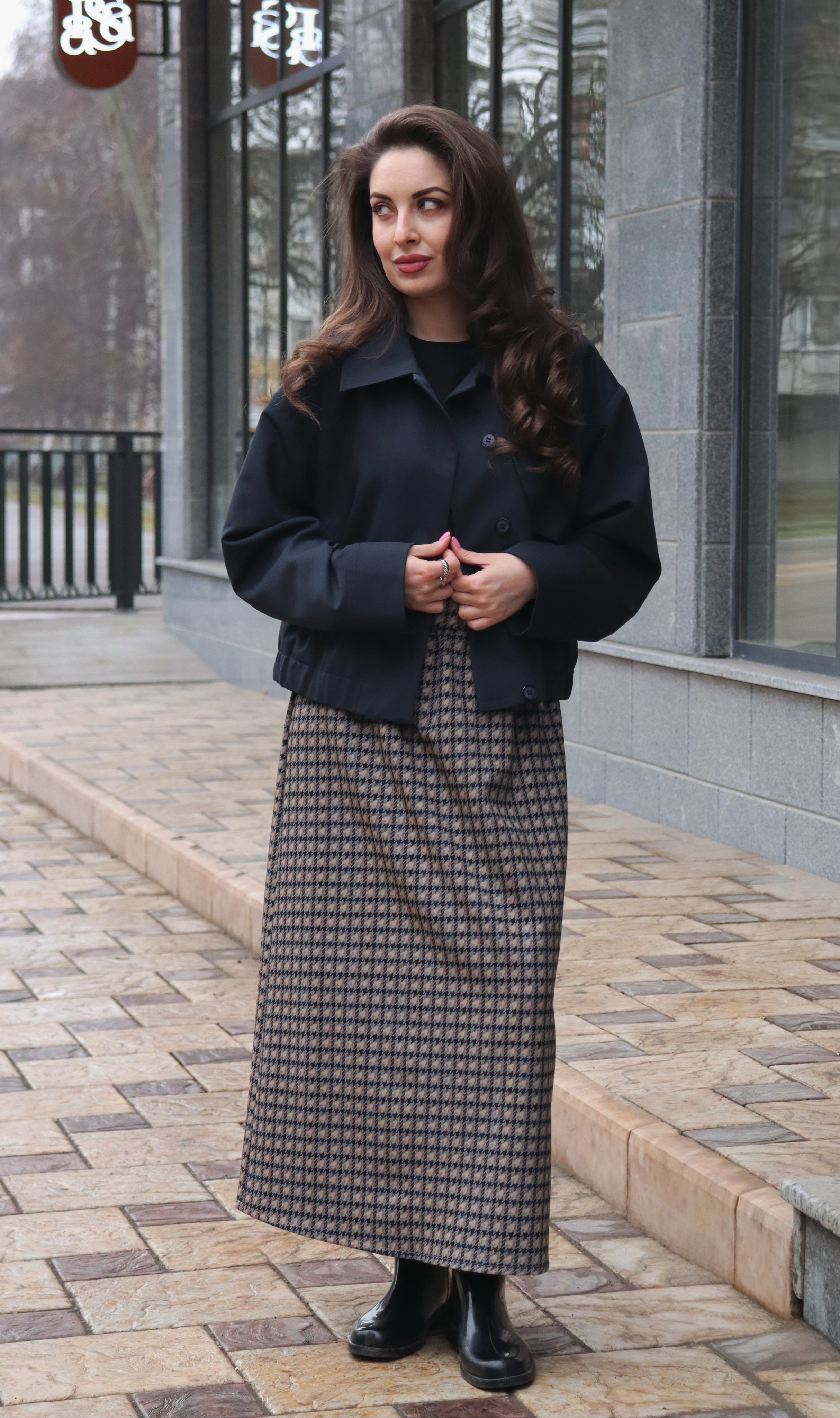 Ткань не мнётся и хорошо держит форму, поэтому юбка выглядит аккуратно с утра до вечера и не требует постоянного контроля. Прямой, вытянутый силуэт визуально стройнит и делает образ собранным, а классический рисунок добавляет универсальности — юбку легко сочетать с жакетами, свитерами и блузами.