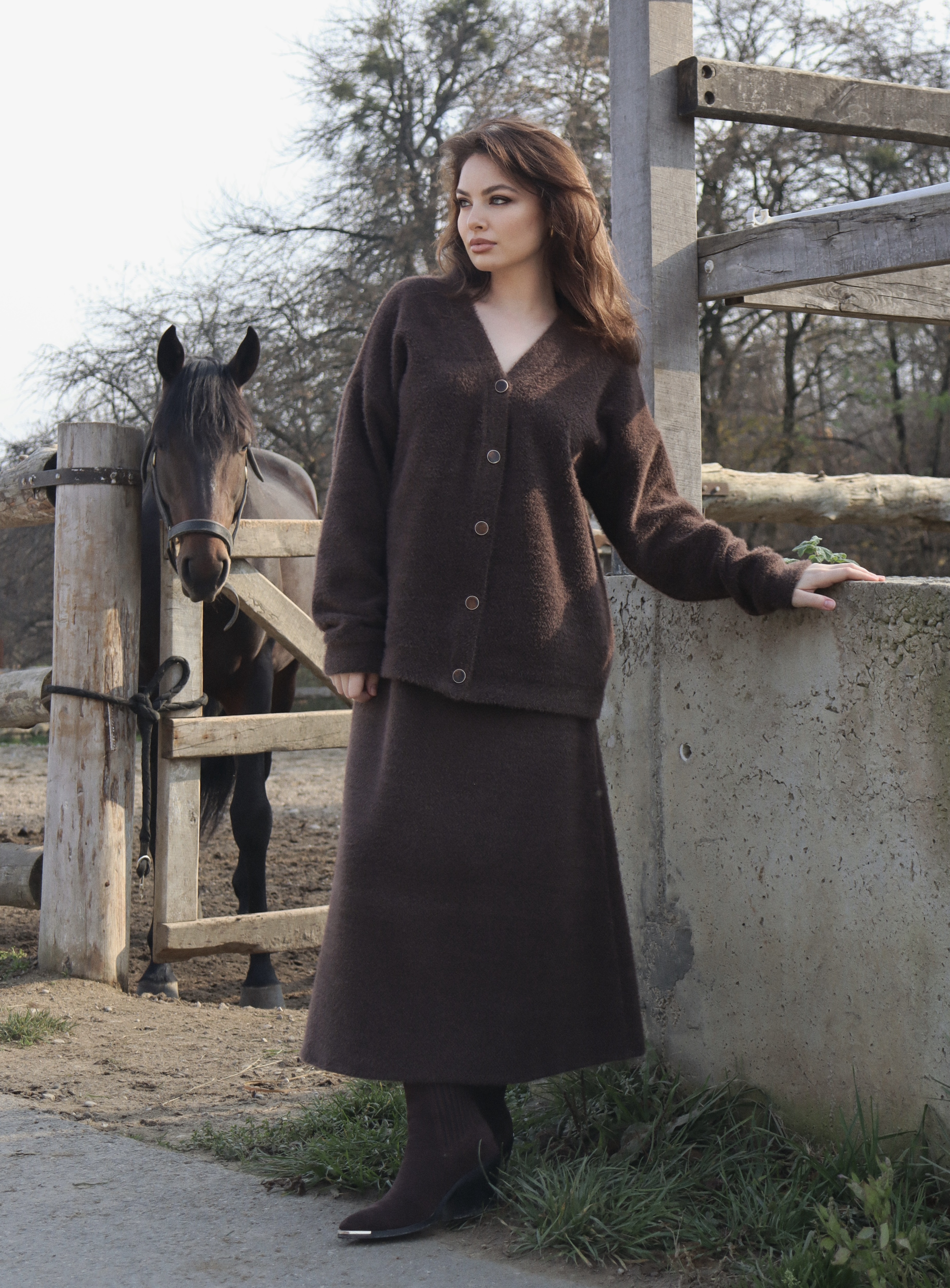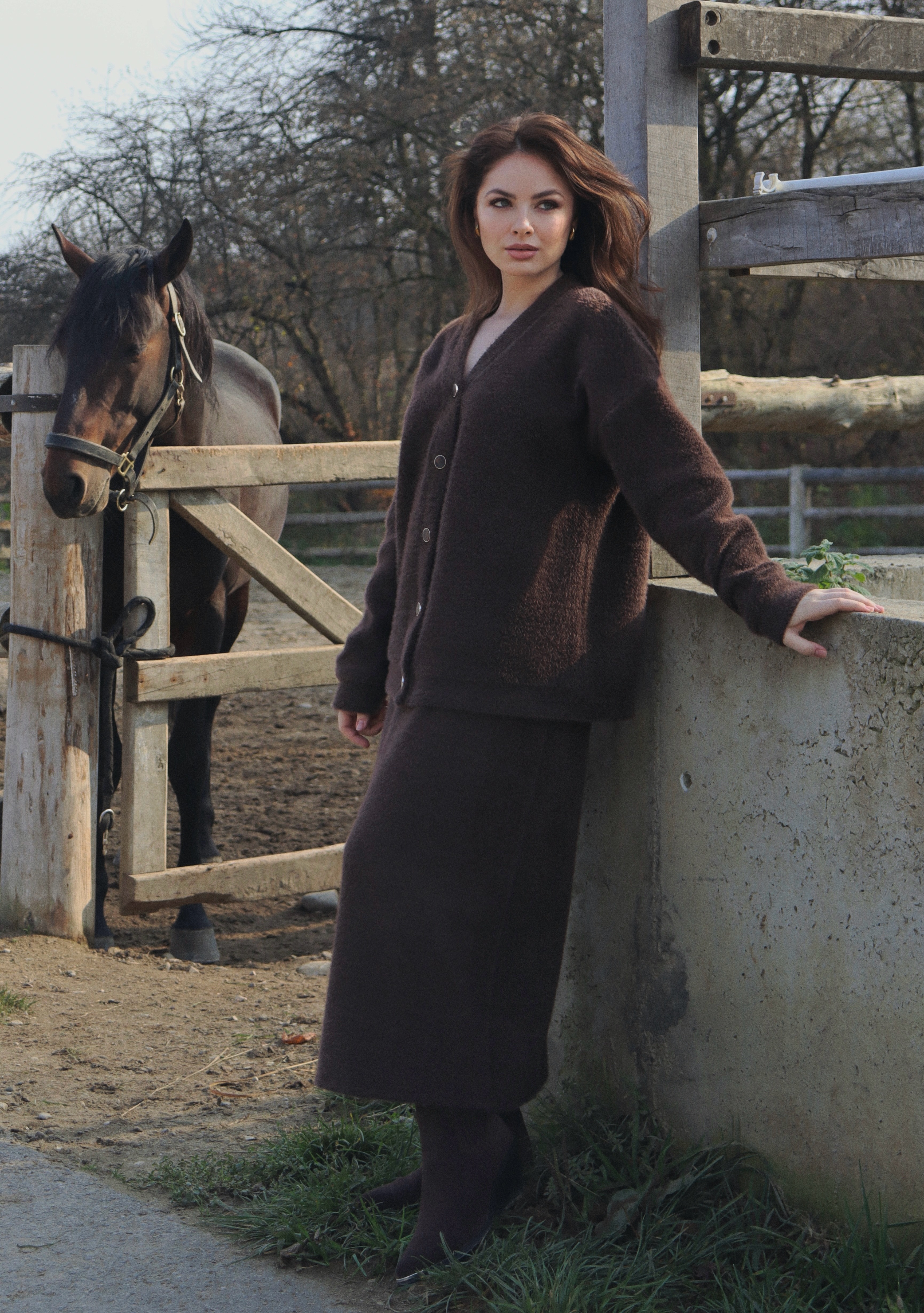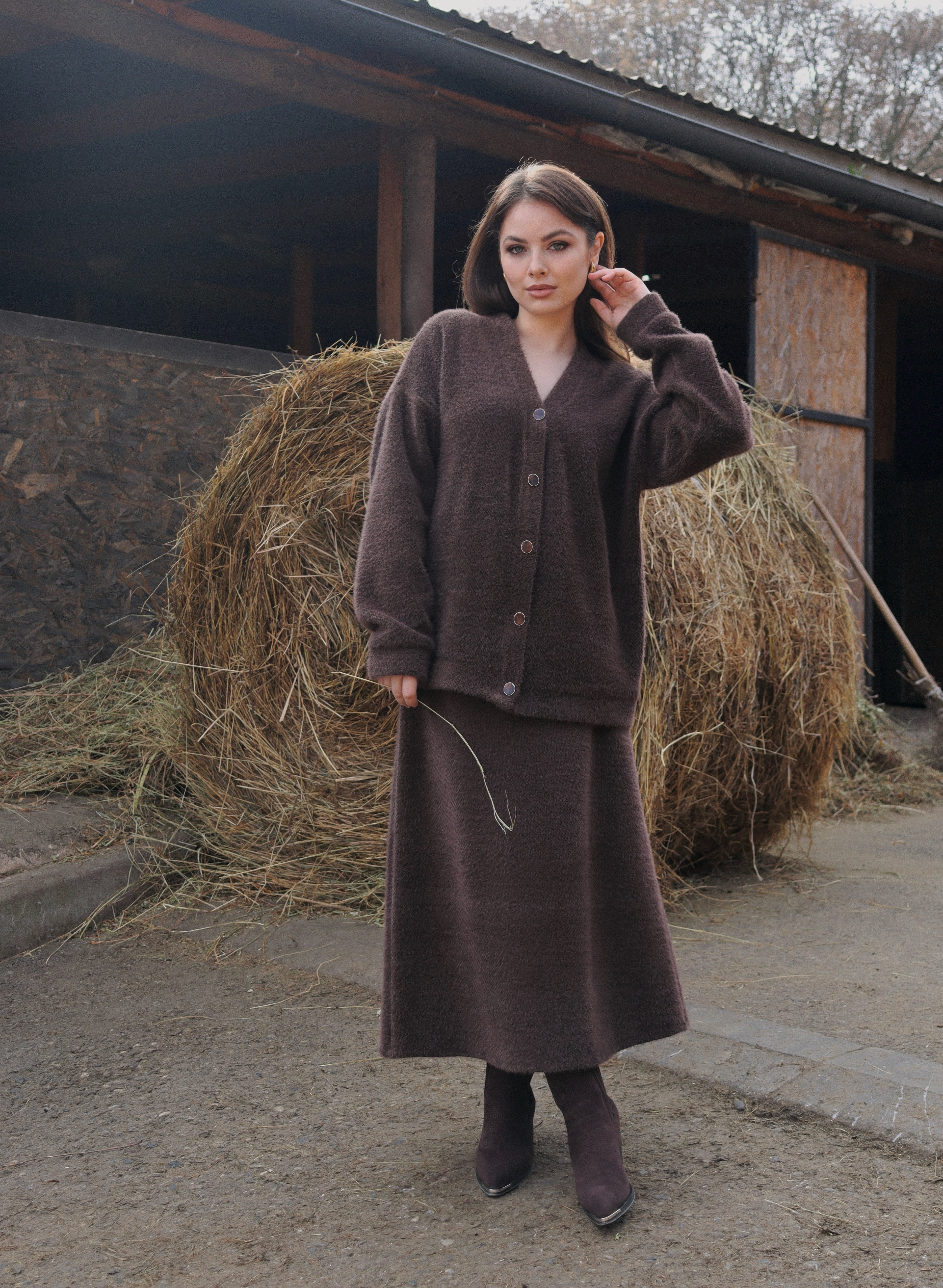 Юбка не колется, приятно ощущается на теле и отлично держит форму. Подходит для прогулок, офиса и тёплых повседневных образов. Легко комбинируется с кардиганом «Зима» — получается идеальный зимний комплект.