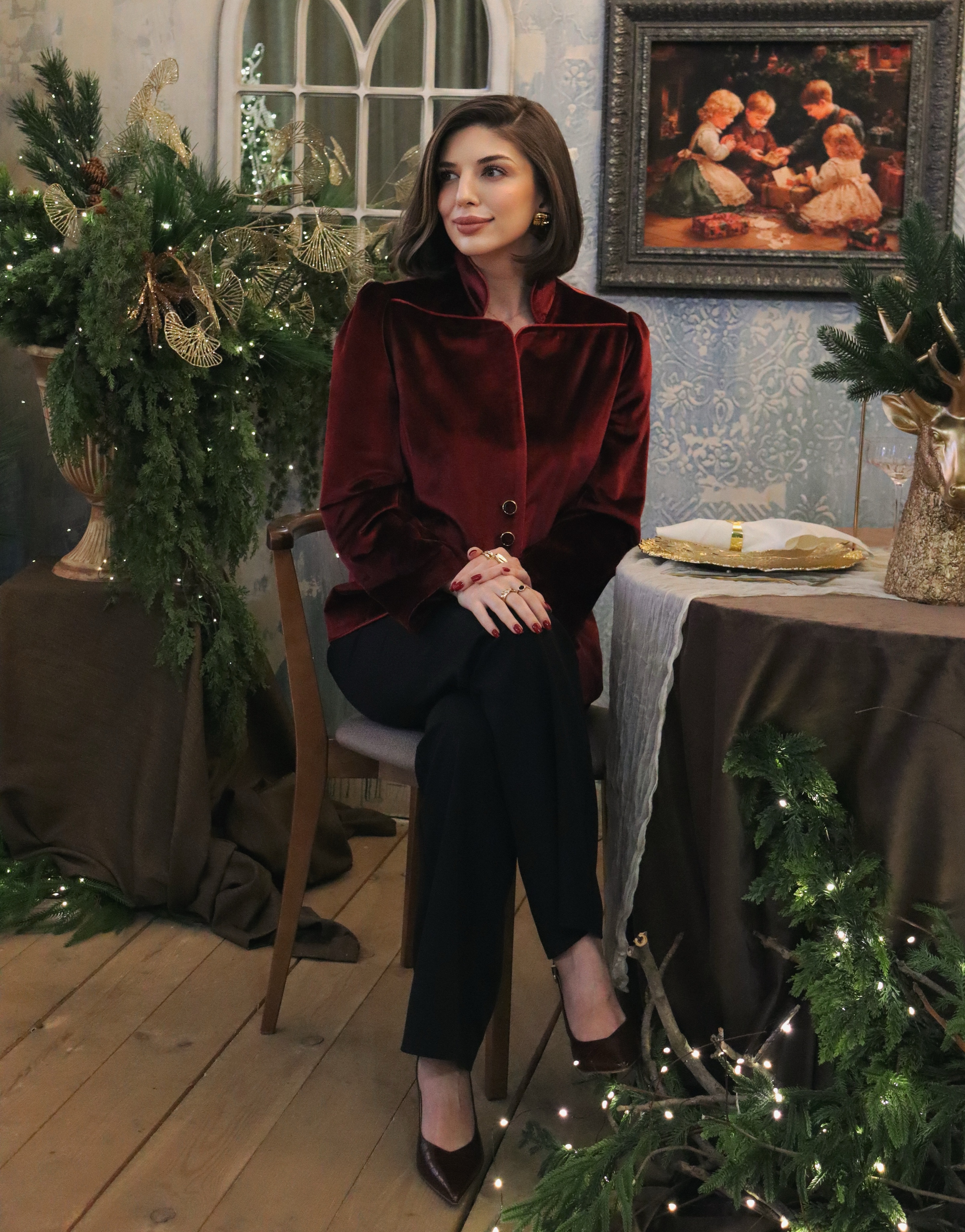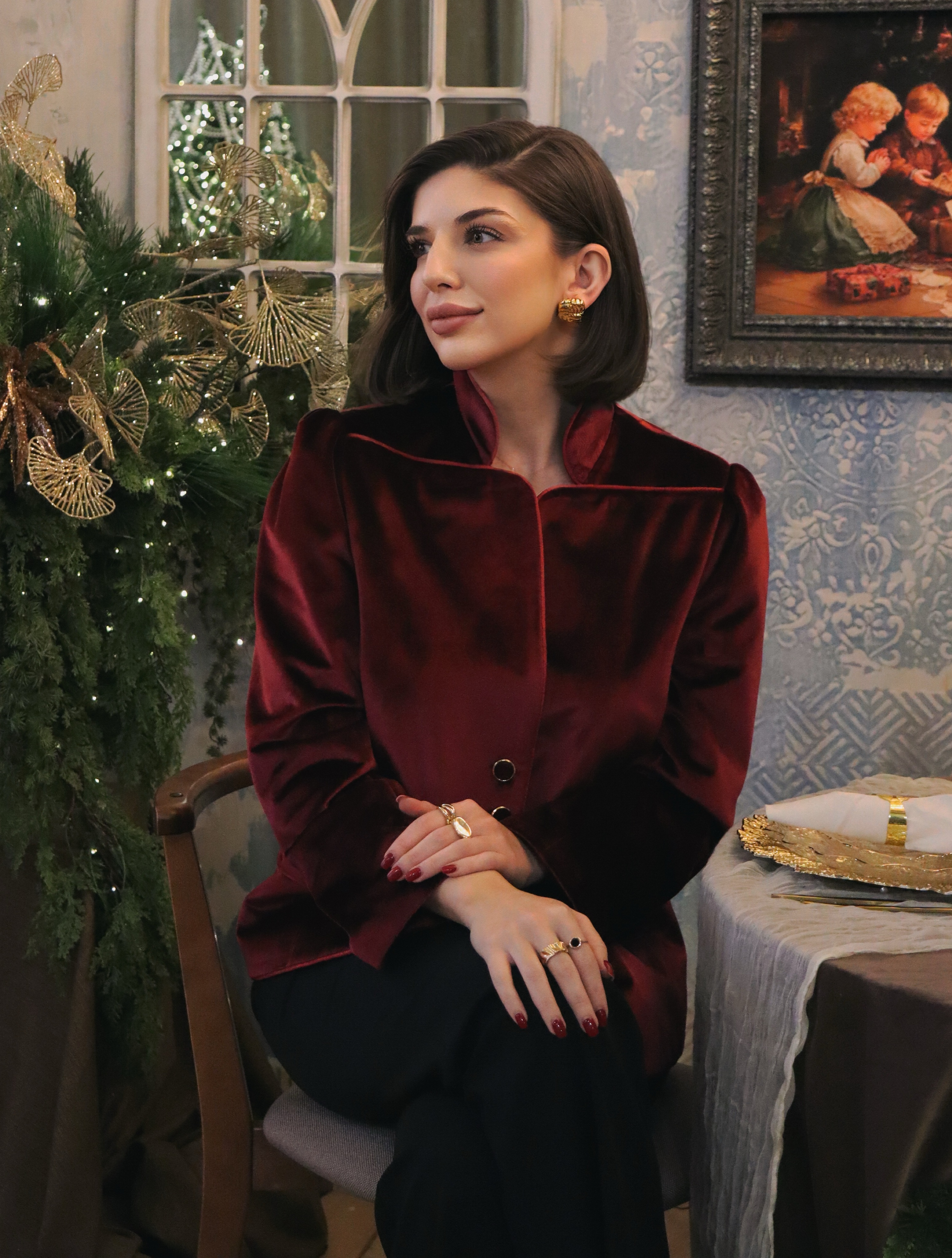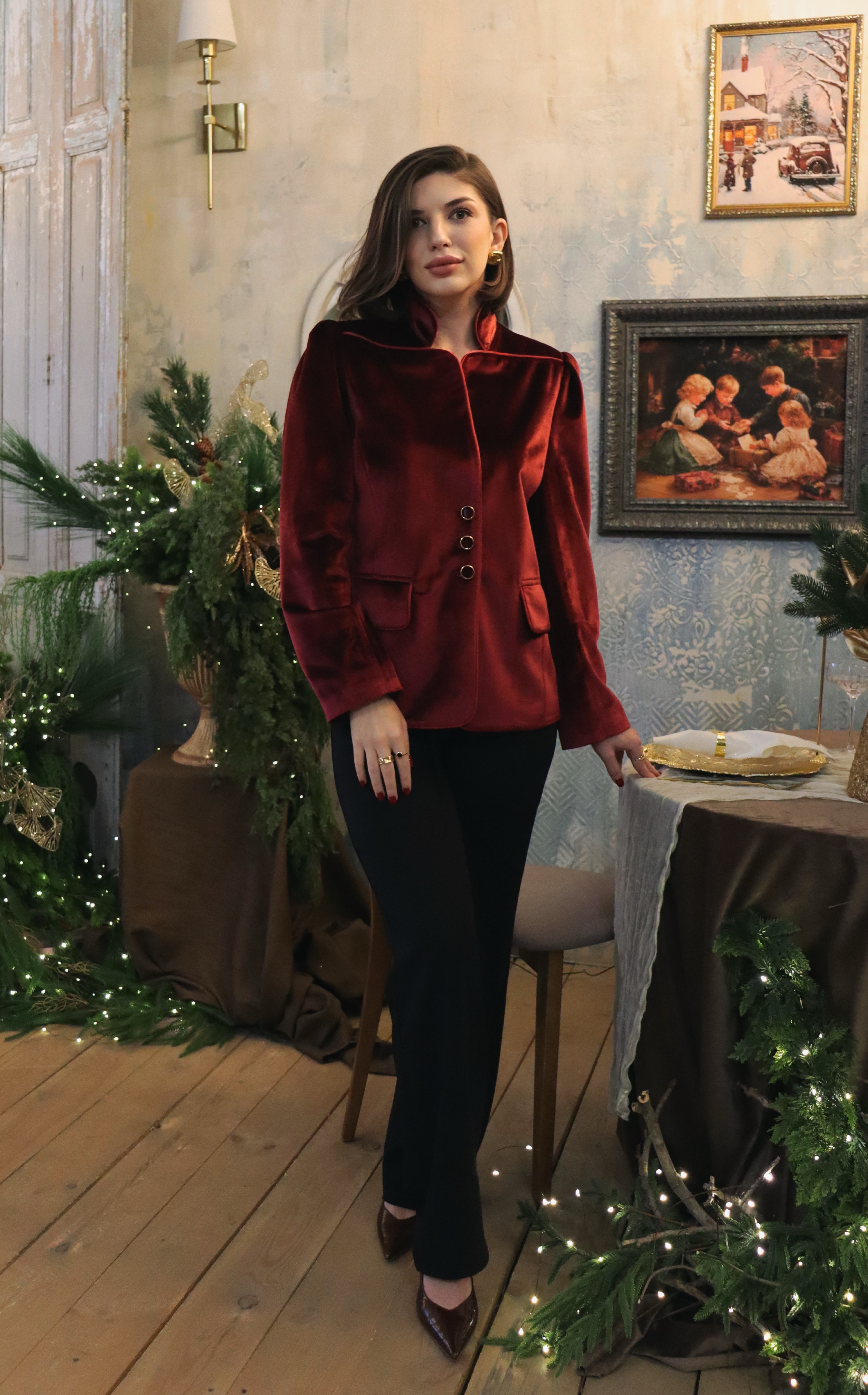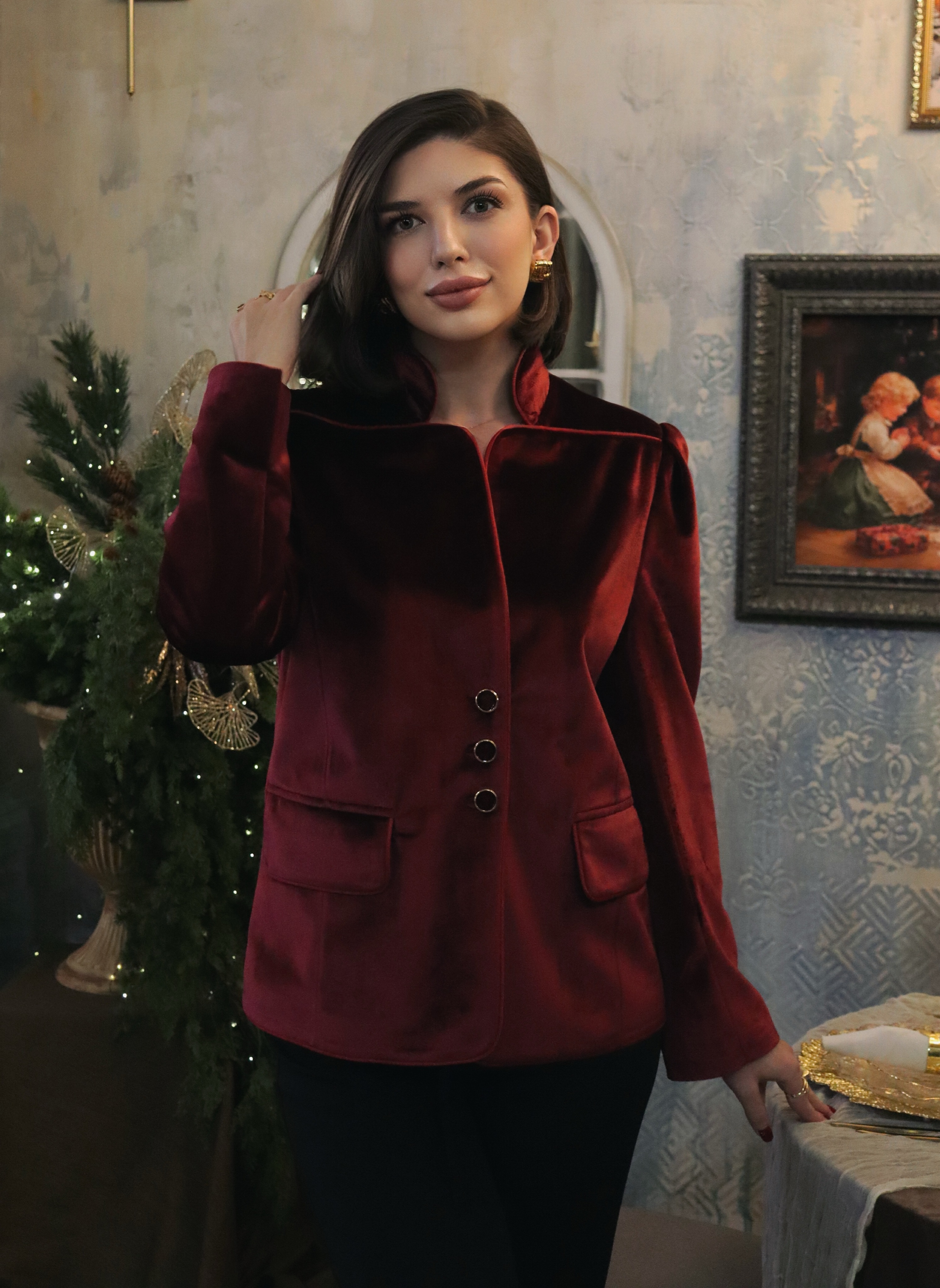 Жакет из бархата в тёмно-бордовом цвете — выразительная модель с благородным характером. Мягкий, глубокий блеск бархата подчёркивает насыщенность оттенка и придаёт образу особую элегантность. Аккуратный кант подчёркивает линии кроя, добавляя жакету графичности и завершённости.